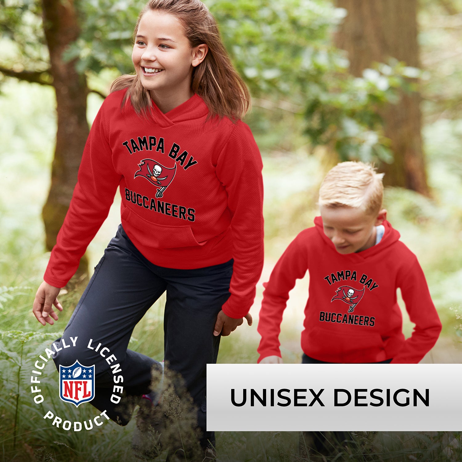 Our youth gameday Tampa Bay Buccaneers football pullover hoodie with a front pouch pocket is the ideal sweatshirt to wear on gameday. This Buccaneers hoodie for kids is comfortable and great for showing team pride all year long. This is an essential piece of girls and boys football apparel for pro football fans. Our team-colored hoodie sweatshirts are the perfect fan apparel for school and sports games. This hooded pullover with a pocket is ideal for warm or cold weather games. Buccaneers football pullover hoodie is made from a cotton poly blend material with raglan sleeves.    These youth pro football sweatshirts have high quality features. Our youth gameday pullover hoodies feature 1x1 ribbing at cuffs and waistband. This Tampa Bay hoodie youth sweatshirt has a twill neck tape. The raglan sleeves add a sophisticated look to these pro football team hoodies for boys and girls.    This tagless sweatshirt ensures the most comfortable fit for boys and girls. The standard fit makes our football team hoodies for boys and girls the perfect kids sweatshirt for young fans. The thermal printed graphics are high definition, true to authentic team color, and resist fading. Our hoodies also make the best Buccaneers gifts for boys and girls. Youth football apparel is the perfect birthday gift for any professional sports fan. Our youth football team hoodies for boys and girls are great for wearing to school, the stadium, or while you're watching the game at home.