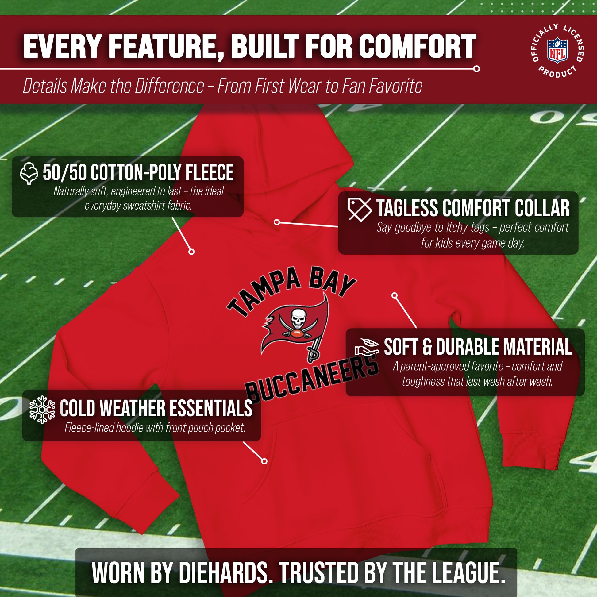 Our youth gameday Tampa Bay Buccaneers football pullover hoodie with a front pouch pocket is the ideal sweatshirt to wear on gameday. This Buccaneers hoodie for kids is comfortable and great for showing team pride all year long. This is an essential piece of girls and boys football apparel for pro football fans. Our team-colored hoodie sweatshirts are the perfect fan apparel for school and sports games. This hooded pullover with a pocket is ideal for warm or cold weather games. Buccaneers football pullover hoodie is made from a cotton poly blend material with raglan sleeves. These youth pro football sweatshirts have high quality features. Our youth gameday pullover hoodies feature 1x1 ribbing at cuffs and waistband. This Tampa Bay hoodie youth sweatshirt has a twill neck tape. The raglan sleeves add a sophisticated look to these pro football team hoodies for boys and girls. This tagless sweatshirt ensures the most comfortable fit for boys and girls. The standard fit makes our football team hoodies for boys and girls the perfect kids sweatshirt for young fans. The thermal printed graphics are high definition, true to authentic team color, and resist fading. Our hoodies also make the best Buccaneers gifts for boys and girls. Youth football apparel is the perfect birthday gift for any professional sports fan. Our youth football team hoodies for boys and girls are great for wearing to school, the stadium, or while you're watching the game at home.