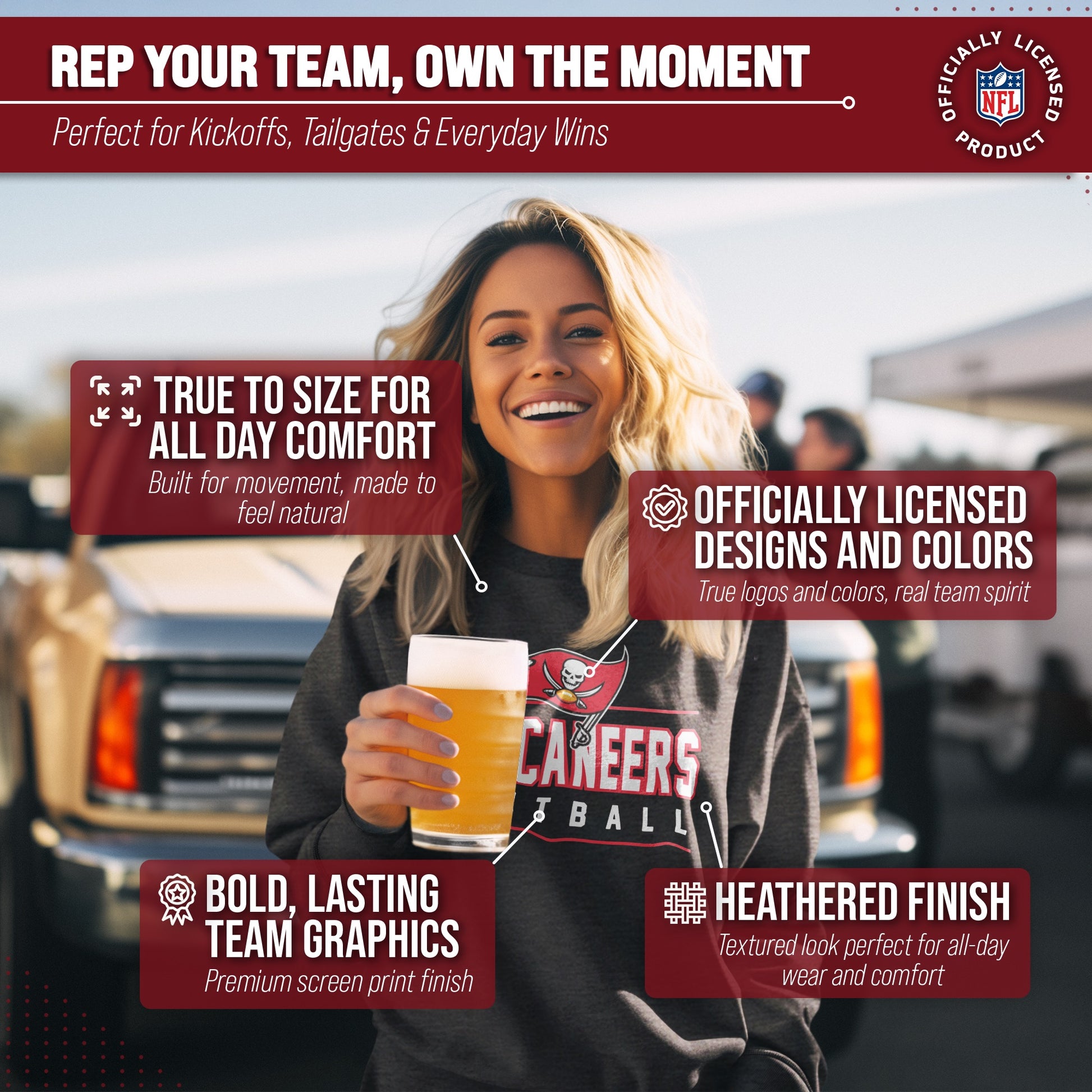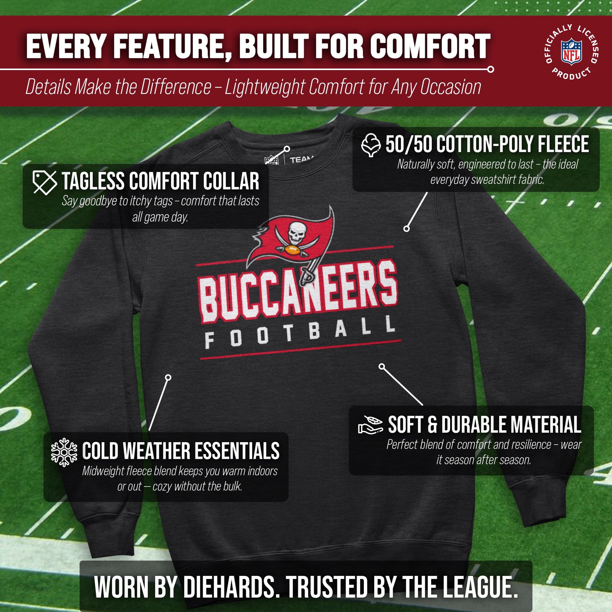 Looking for a tagless, super-soft Tampa Bay Buccaneers crewneck sweatshirt to support your favorite team? Look no further than True Fan Crewneck. Our cotton-poly fleece blend provides a perfect fit and feel for those with sensitive skin, while the high stitch density ensures the officially licensed Buccaneers graphics will last wash after wash. The official wordmark design gives you the look of a loyal and seasoned sports fan, and the unique material gives a trendy, distressed look without that heavy printed feel.  The unisex fit means that both men and women can show their team pride in style. These Buccaneers sweatshirts are the perfect Tampa Bay Buccaneers gifts for men, Tampa Bay Buccaneers gifts for women, Tampa Bay Buccaneers merchandise, gear, and Tampa Bay Buccaneers clothes for any fan of the game. Give this Tampa Bay Buccaneers pullover sweatshirt as Buccaneers gifts for Tampa Bay Buccaneers fans.  Get your Buccaneers crewneck pullover  today!