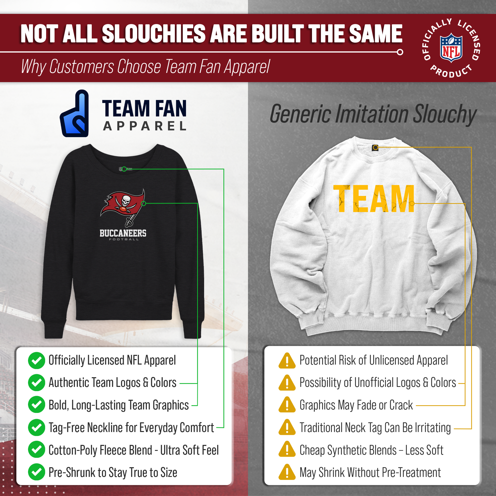 Score with Team Fan Apparel, the ultimate destination for officially licensed NFL apparel for men and women.  We use only the highest-quality screen printing techniques to bring you the most comfortable, durable, and stylish clothing possible. Go ahead and show your team pride at the big game or any time! This premium womens slouchy charcoal crewneck comes in small, medium, large, XL, and XXL. So needless to say, it fits Tampa Bay Buccaneers fans of all types! Maybe you aren't a Buccaneers fan but you know someone who is? Don't worry! This high-quality crewneck is soft, lightweight, breathable, and a GREAT gift for any birthday, anniversary, Mother's day, Valentine's day, or Christmas gift!  So, if you want to stand out as the #1 female fan at the next big game or watch party, you're going to want to be wearing one of these Tampa Bay Buccaneers Women's Big Logo pullover crewnecks.