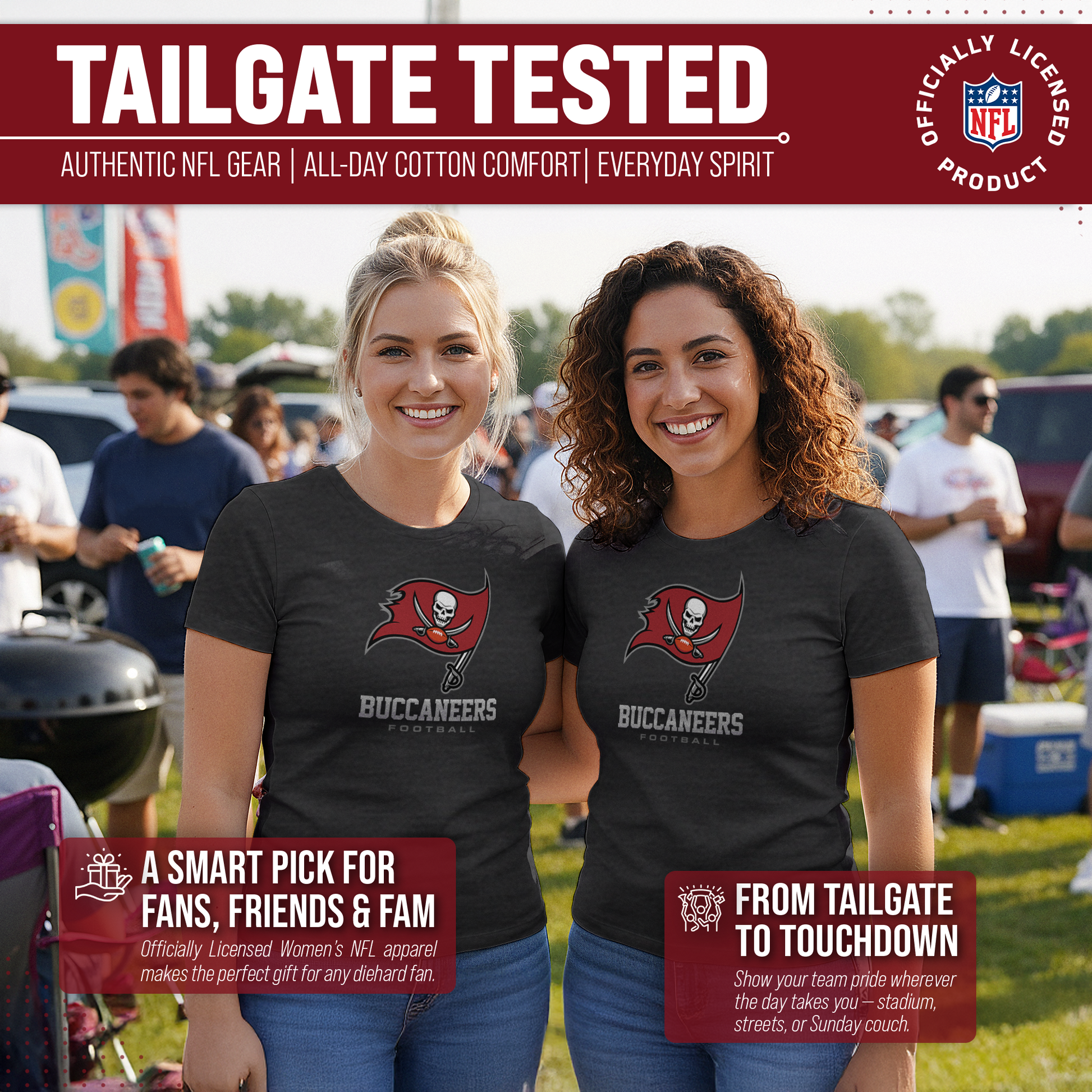 Score with Team Fan Apparel, the ultimate destination for officially licensed NFL apparel for men and women.  We use only the highest-quality screen printing techniques to bring you the most comfortable, durable, and stylish clothing possible. Go ahead and show your team pride at the big game or any time! This premium womens t-shirt comes in small, medium, large, XL, and XXL. So needless to say, it fits Tampa Bay Buccaneers fans of all types! Maybe you aren't a Buccaneers fan but you know someone who is? Don't worry! This high-quality t-shirt is soft, lightweight, breathable, and a GREAT gift for any birthday, anniversary, Mother's day, Valentine's day, or Christmas gift!  So, if you want to stand out as the #1 female fan at the next big game or watch party, you're going to want to be wearing one of these Tampa Bay Buccaneers Women's Big Logo t-shirts.