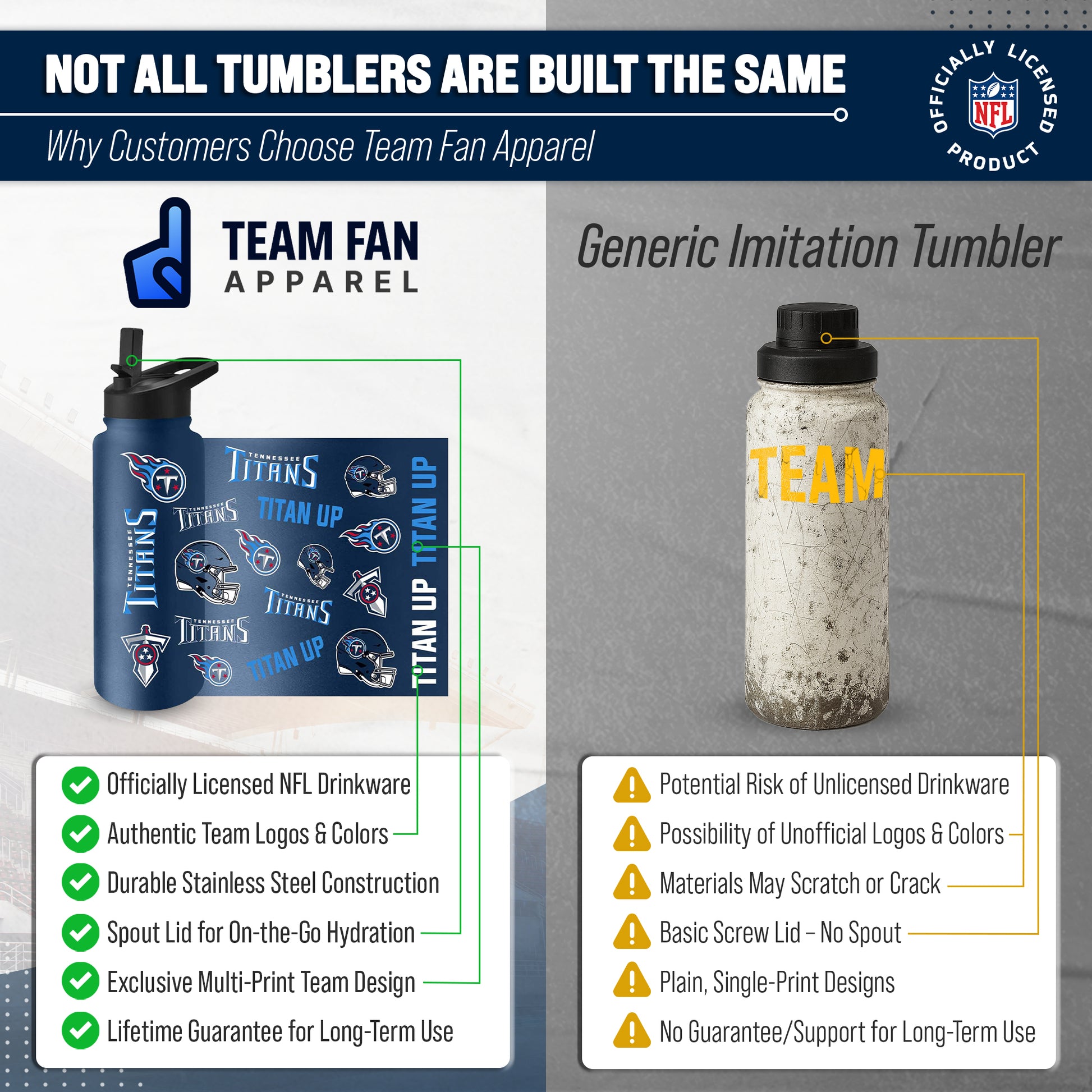 Keep Your Tennessee Titans Team Spirit and Drinks Handy On-the-Go with the NFL Native Quencher Water Bottle! Whether you're heading to the gym or tailgating at the game, this 34oz Titans water bottle is the perfect companion for any fan. Made from durable stainless steel, it's designed to keep your drinks hot or cold for hours. The no-leak dual option lid allows you to sip through a straw or drink straight from the spout. But it's not just for water! This versatile bottle can also hold your favorite coffee, tea, & more. With its insulated design, your beverages will stay at their desired temperature until you're ready for them. Featuring your team's logo & colors, this water bottle proudly displays your loyalty while keeping you hydrated. And when it's time for a refill, simply take off the lid and fill up again. Cheers to staying hydrated in style with the Tennessee Titans Water Bottle! Hand wash only! Great for yourself or any fan in your life, especially for on-the-go and travel!