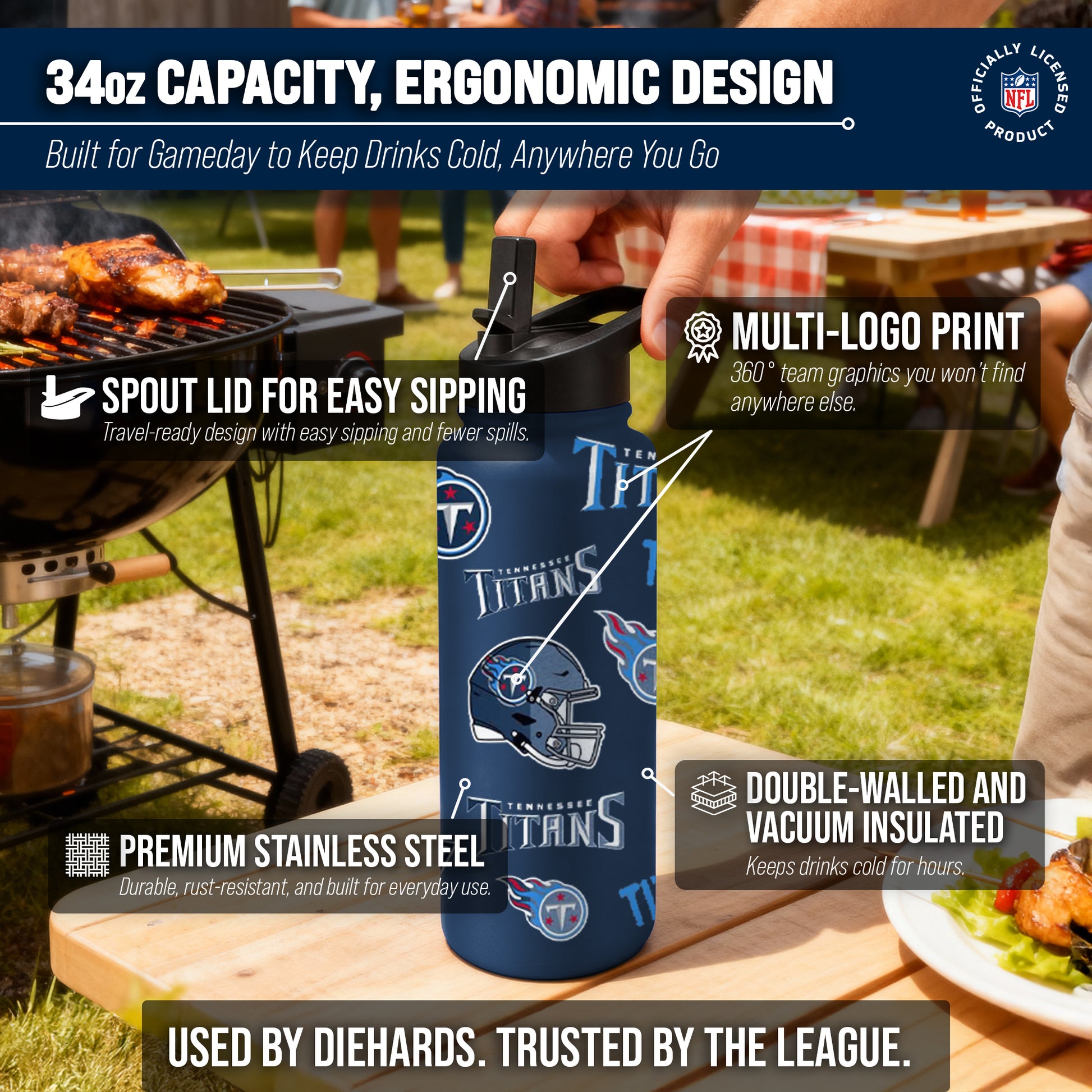Keep Your Tennessee Titans Team Spirit and Drinks Handy On-the-Go with the NFL Native Quencher Water Bottle! Whether you're heading to the gym or tailgating at the game, this 34oz Titans water bottle is the perfect companion for any fan. Made from durable stainless steel, it's designed to keep your drinks cold for hours. The no-leak dual option lid allows you to sip through a straw or drink straight from the spout. But it's not just for water! This versatile bottle can also hold your favorite iced coffee, tea, & more. With its insulated design, your beverages will stay at their desired temperature until you're ready for them. Featuring your team's logo & colors, this water bottle proudly displays your loyalty while keeping you hydrated. And when it's time for a refill, simply take off the lid and fill up again. Cheers to staying hydrated in style with the Tennessee Titans Water Bottle! Hand wash only! Great for yourself or any fan in your life, especially for on-the-go and travel!
