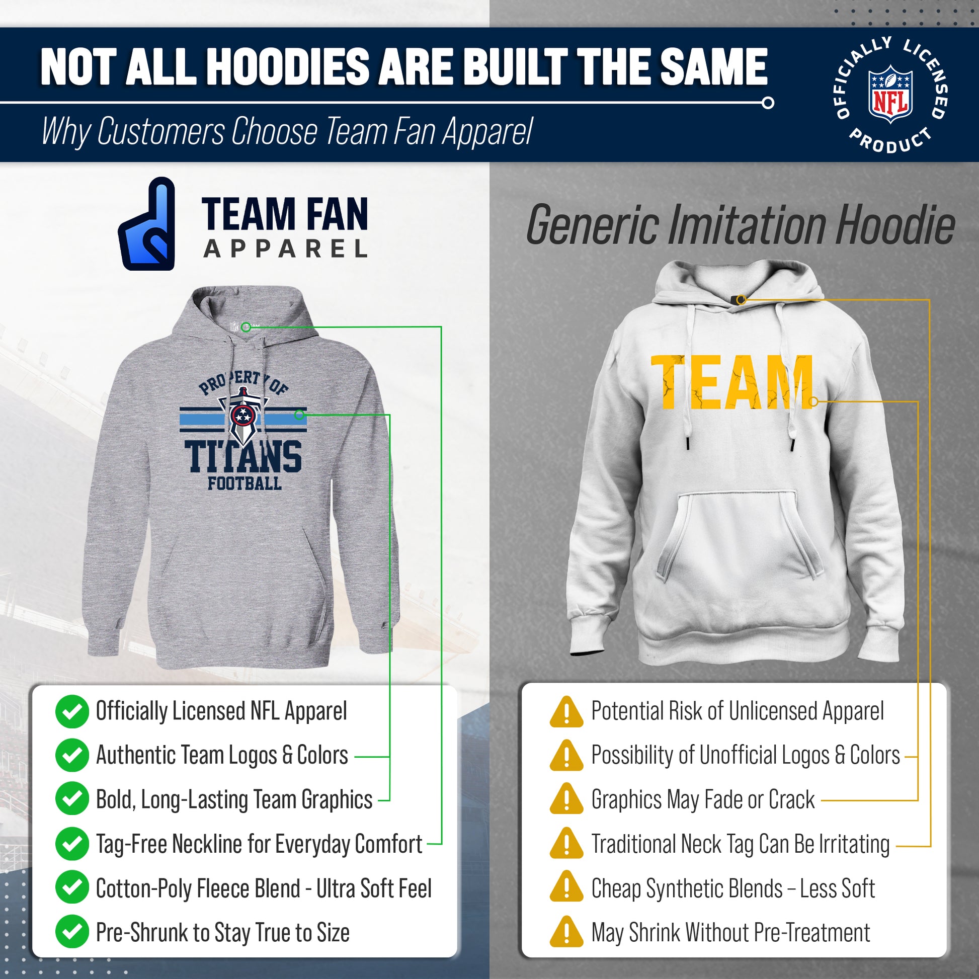 Our Property of Tennessee Titans hooded sweatshirt is a pro football hoodie with 8.5 oz fleece lining that features official Property of graphics. Our hoodies for men and women are super comfortable, run true to size, and are great for showing your Titans pride all year long. The tagless Tennessee hooded sweatshirt is perfect for tailgates, gamedays, and showing off your team spirit. Our pullover hoodies are ideal Tennessee gifts for men and women football fans and the unisex fit makes them ideal for both men and women. The Tennessee hoodie is essential apparel for protecting yourself from the elements. The fleece material, ribbed cuffs, and waistband keep all the warmth in, so there's no need for a jacket in the fall months, our hoodie sweatshirts have you covered. These comfortable hoodies feature the official Tennessee Titans colors and graphics. The graphics will stay crisp and wear after wear and year after year. This pro football sweatshirt is designed for comfort. The pro football hooded sweatshirt features ribbed cuffs and waistband, jersey lined hood with metal eyelets, adjustable drawstrings, and a spacious front pouch pocket. Show your team pride with this Property of Titans sweatshirt! This hoodie is pre-shrunk and made from a dual blend of cotton poly fleece that is ideal for that tailgate or gameday when the temperature drops. The football sweatshirts for women and men help you gear up and get ready to cheer the Tennessee Titans to victory.