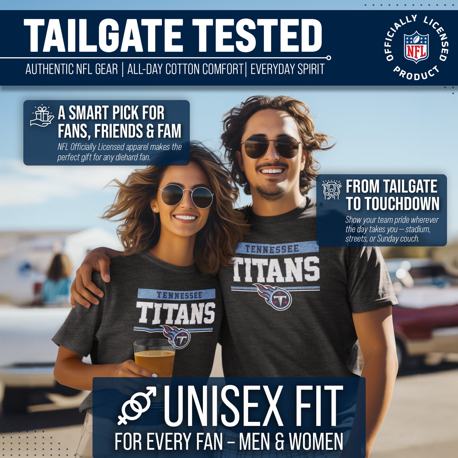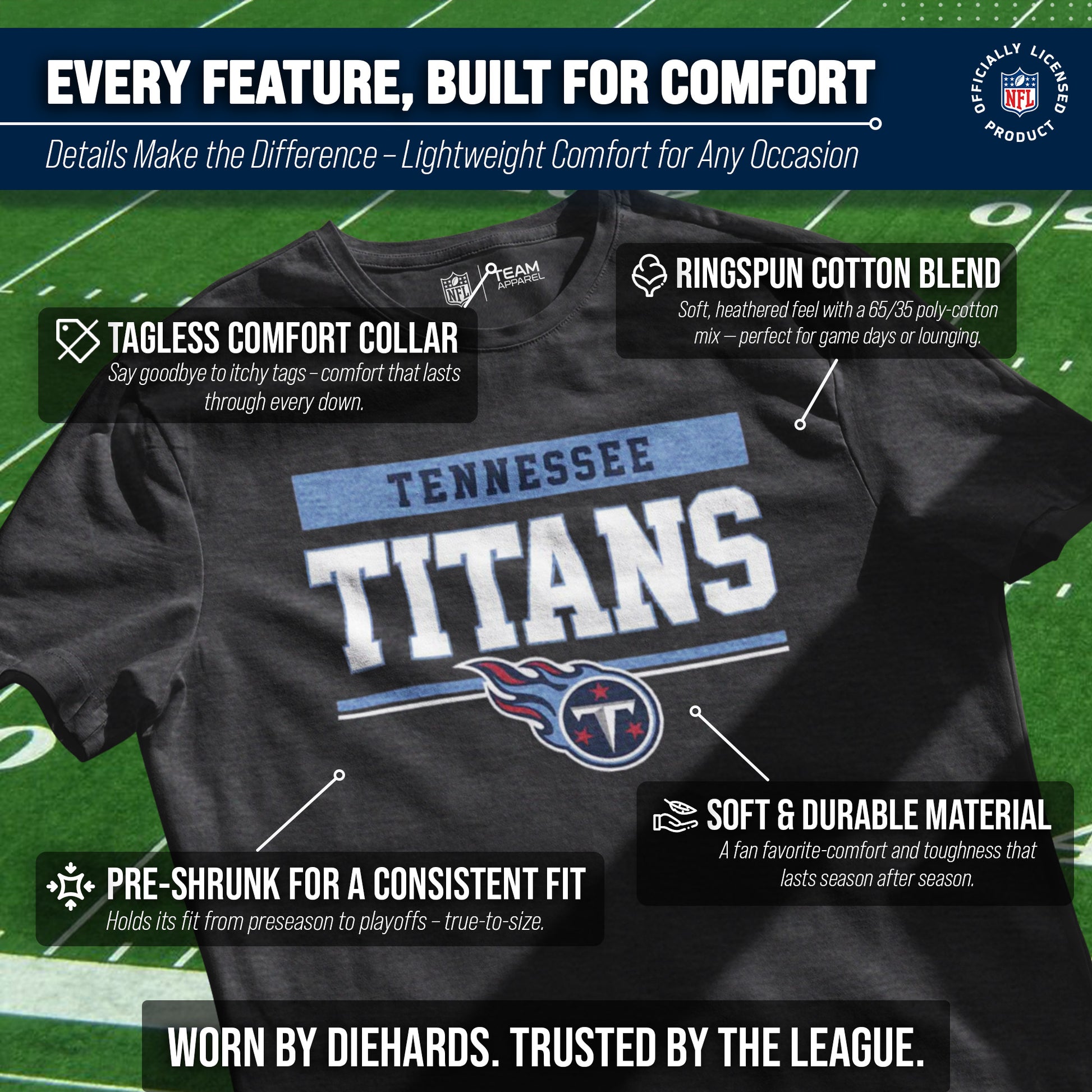 Heather/charcoal wordmark womens and mens Tennessee Titans t shirts are the ultimate light, soft, and comfortable tee. These Tennessee Titans tshirts are the most versatile football apparel. Let us help you celebrate and showcase team pride with our durable and lightweight Tennessee Titans t shirts for men and women. This tee features a quality, screen printed wordmark that will last wear after wear. The official wordmark design gives you the look of a loyal and seasoned sports fan and the unique heather, dual-blended material gives a trendy, distressed look without that heavy printed feel. Made of 50% ringspun cotton and 50% polyester, the dual blend material is extremely soft, smooth and comfortable. These Tennessee Titans shirts for men and women comes without a tag, so you'll never feel annoyed or irritated by those pesky neck tags again!     This tee is essential apparel for any football fan. This classic Tennessee Titans t shirt will stand out and is perfect for the gameday tailgate, hanging out with friends, or wearing to the gym. The unisex fit and design makes it ideal for both men and women! Quality [team short] t shirt makes the best birthday, Christmas, or graduation gifts for [team short] fans; Our Tennessee Titans shirts run true to size. All quality logos and colors are officially licensed and are of the highest quality. Show off your team pride with this official short sleeve Tennessee Titans t shirt!