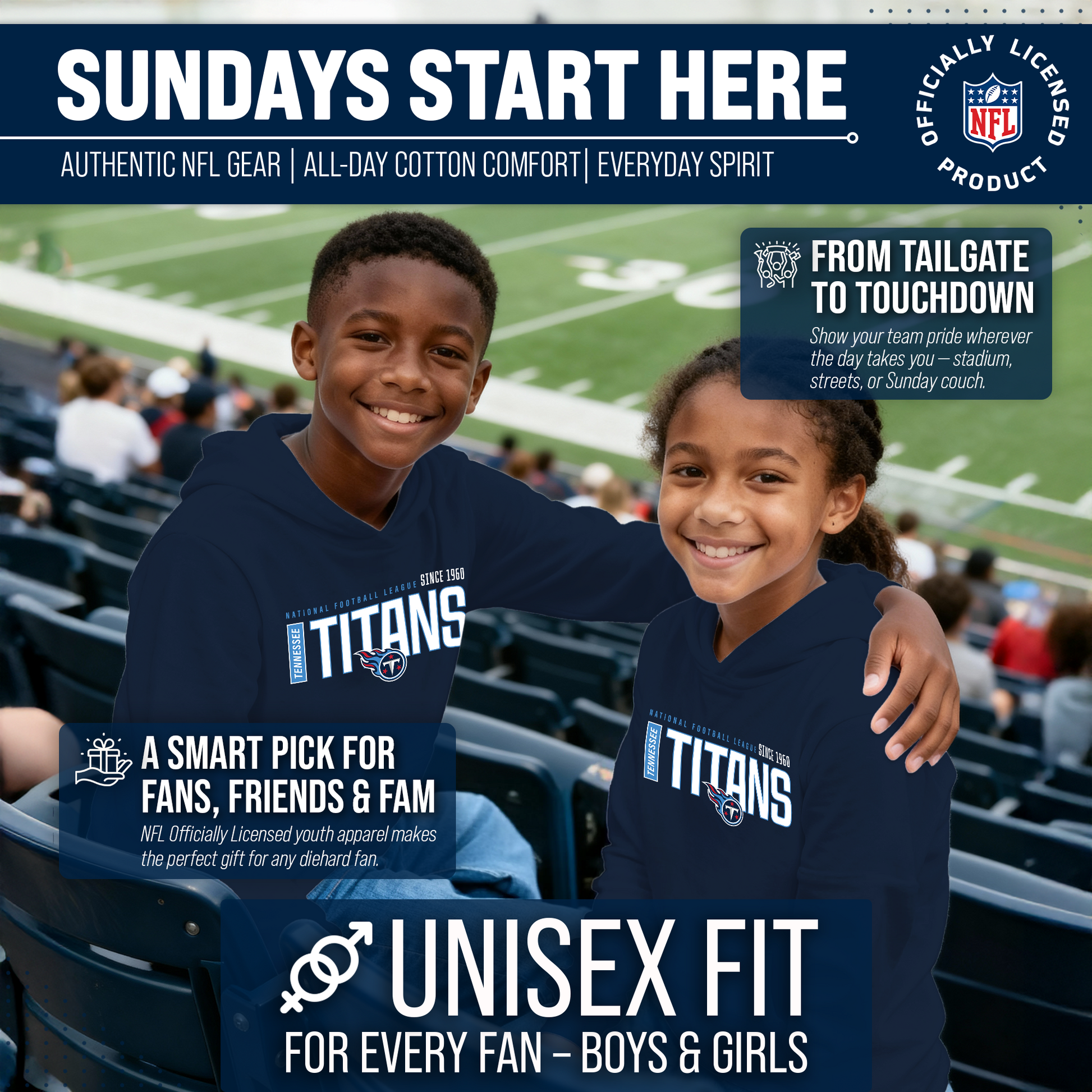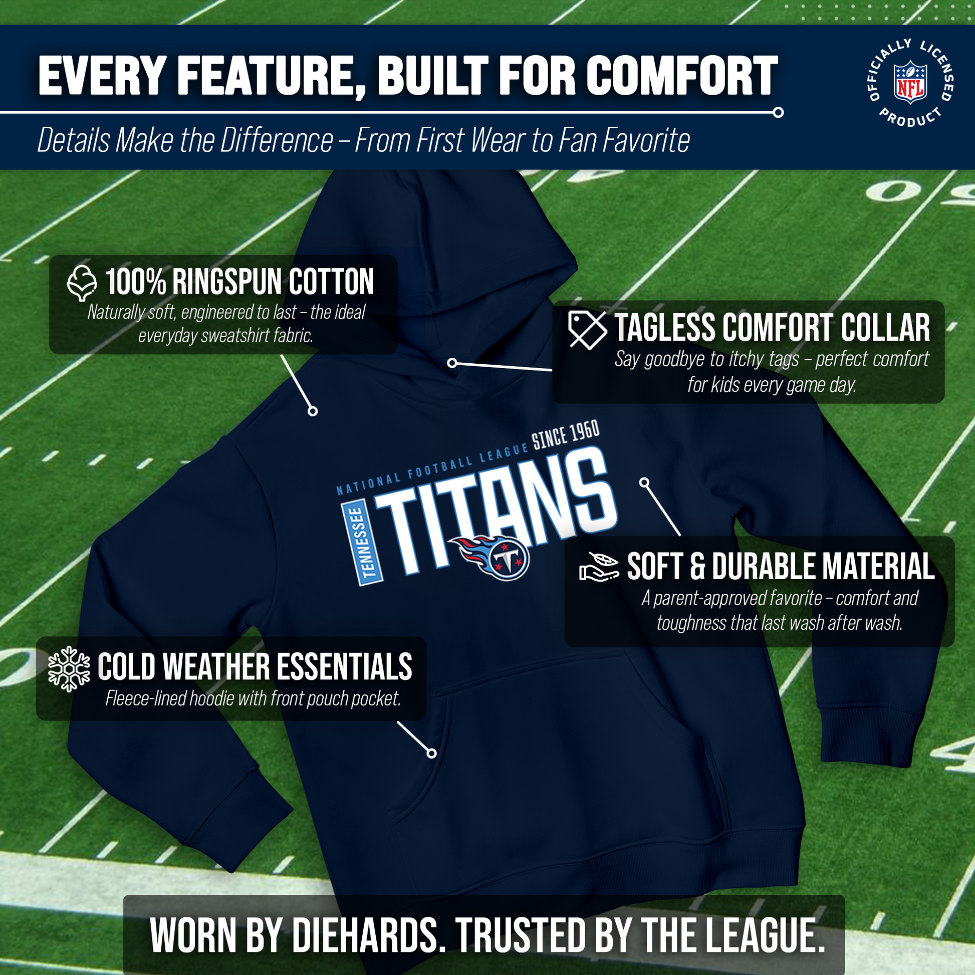Hey there, young sports fans! Get ready to show off your team spirit with the Team Fan Apparel Tennessee Titans Youth Modern Endzone Football Fleece Hooded Sweatshirt! Made from a soft and cozy cotton polyester fleece, this sweatshirt is perfect for staying warm on game day or any day. The unisex design makes it suitable for both boys and girls, and its tag-less feature ensures ultimate comfort all day long. Featuring an original modern endzone design that proudly displays your team's colors and logos, this youth hoodie will be turning heads everywhere it's worn. The front pouch pocket and fleece hood will keep you warm on those cold game days as you cheer on your Titans! Just pull it on and go! So whether you're at the stadium or hanging out with friends, make sure you're representing your team in style with our NFL youth apparel. Printed and designed in the USA, have confidence your sweatshirt will last! Order now and get your future pro geared up to be the next super fan!