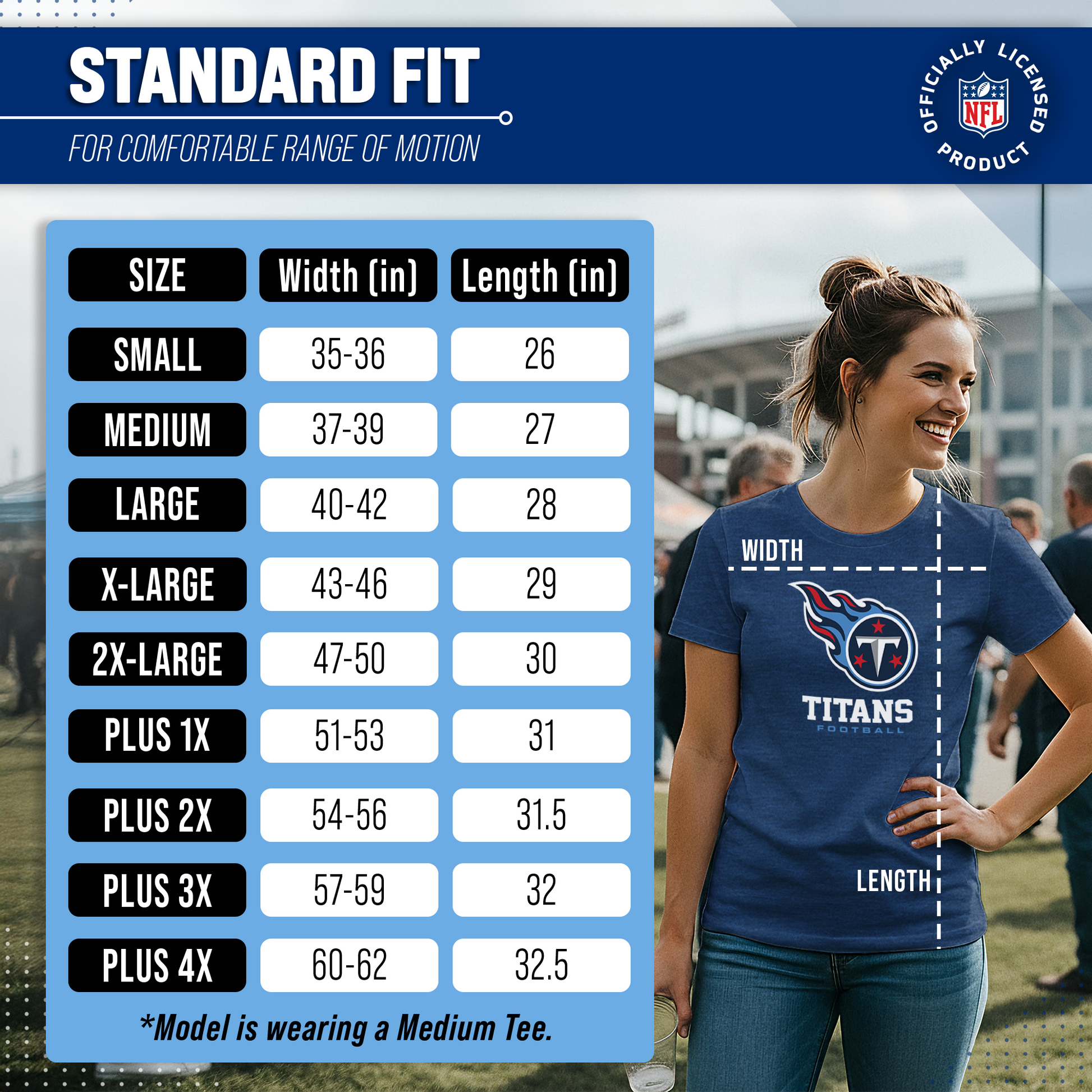 Score with Team Fan Apparel, the ultimate destination for officially licensed NFL apparel for men and women. We use only the highest-quality screen printing techniques to bring you the most comfortable, durable, and stylish clothing possible. Go ahead and show your team pride at the big game or any time! This premium womens t-shirt comes in small, medium, large, XL, and XXL. So needless to say, it fits Tennessee Titans fans of all types! Maybe you aren't a Titans fan but you know someone who is? Don't worry! This high-quality t-shirt is soft, lightweight, breathable, and a GREAT gift for any birthday, anniversary, Mother's day, Valentine's day, or Christmas gift! So, if you want to stand out as the #1 female fan at the next big game or watch party, you're going to want to be wearing one of these Tennessee Titans Women's Big Logo t-shirts.