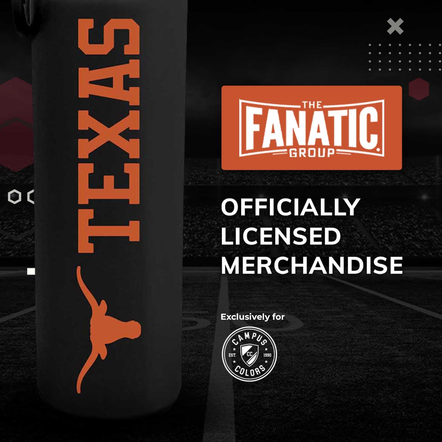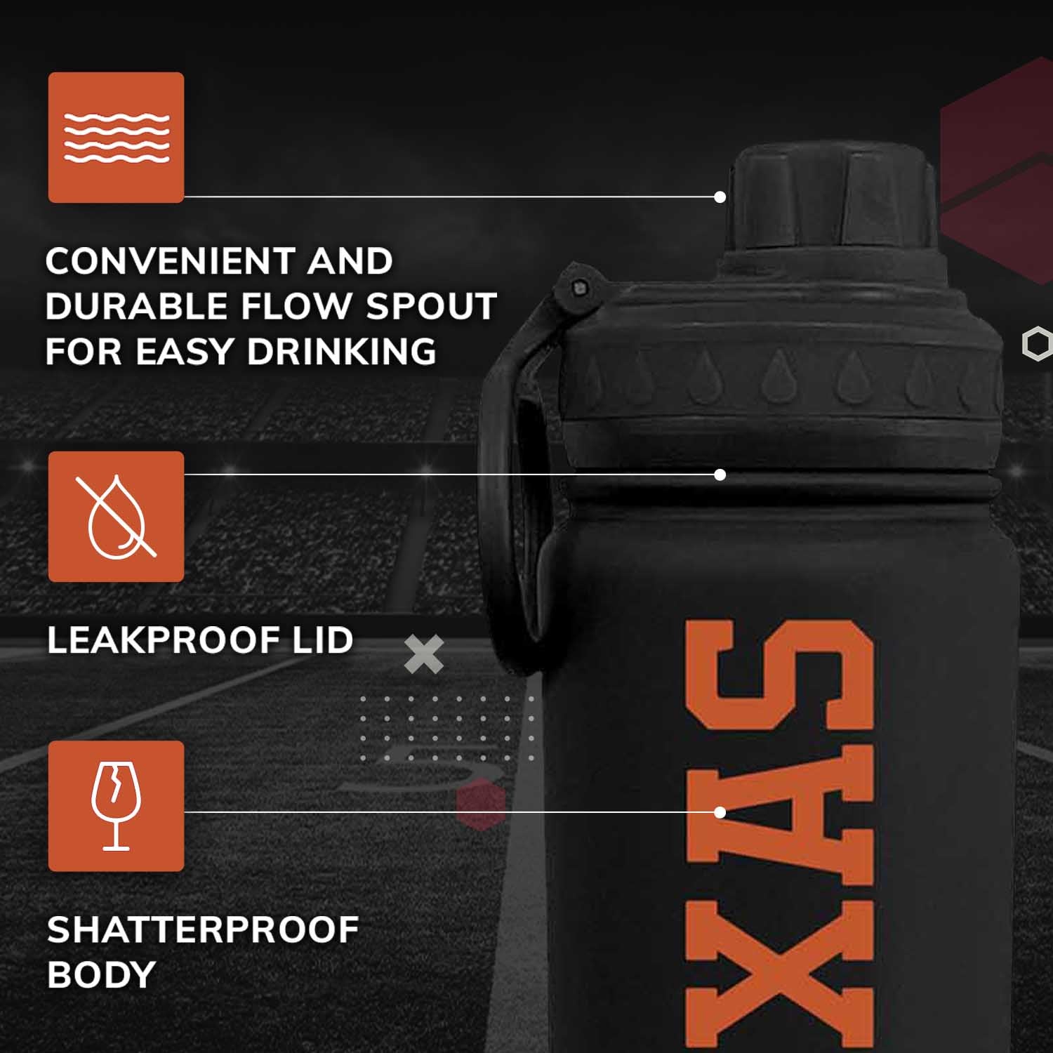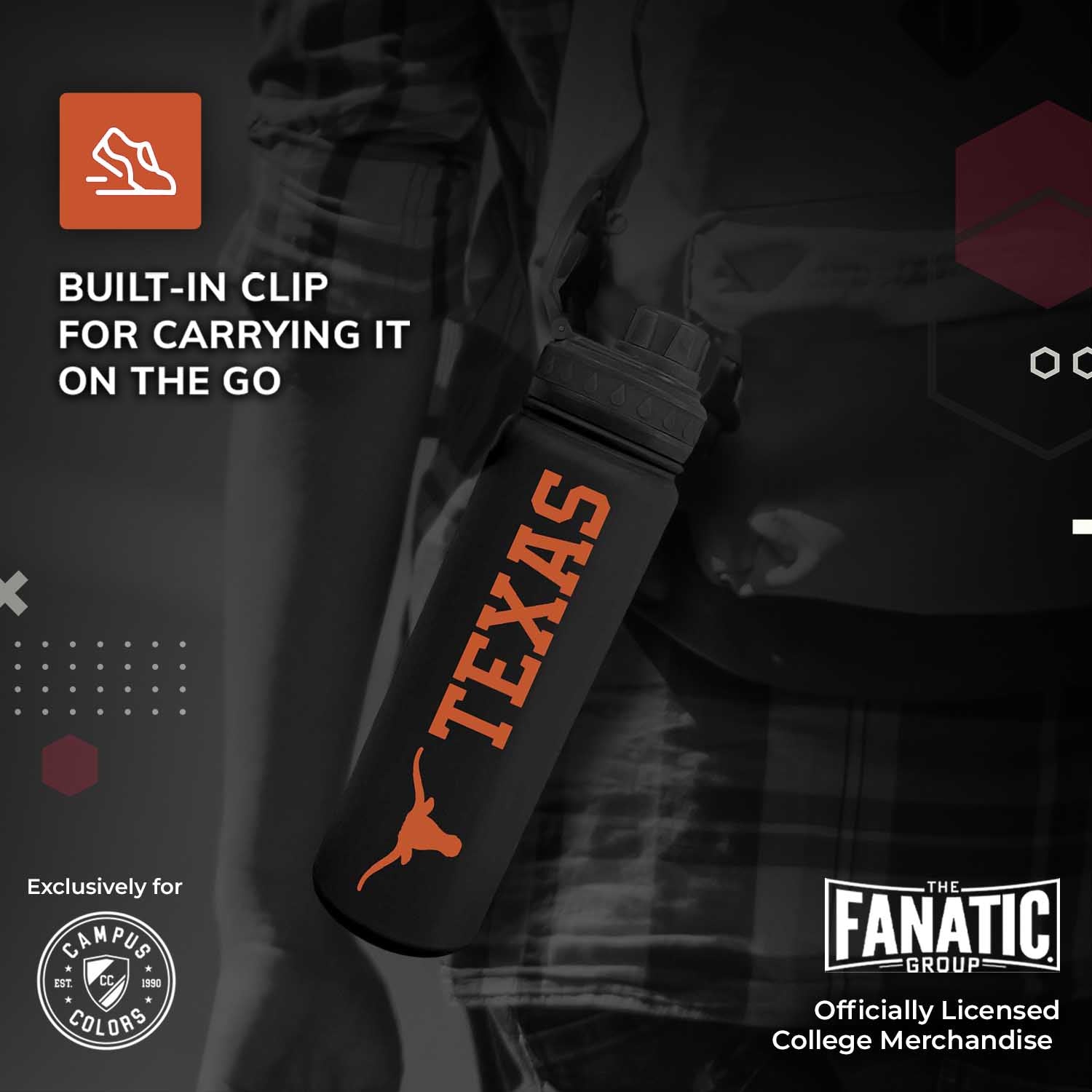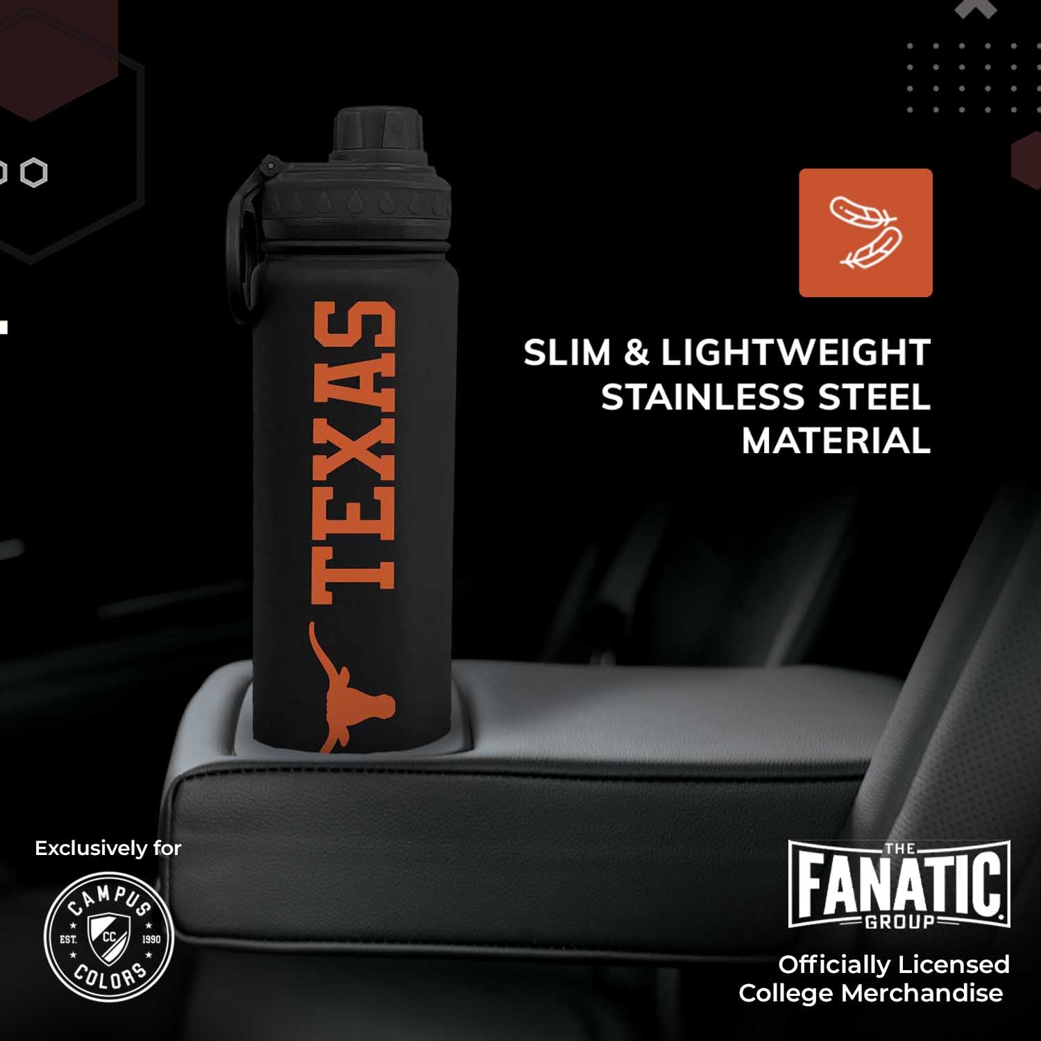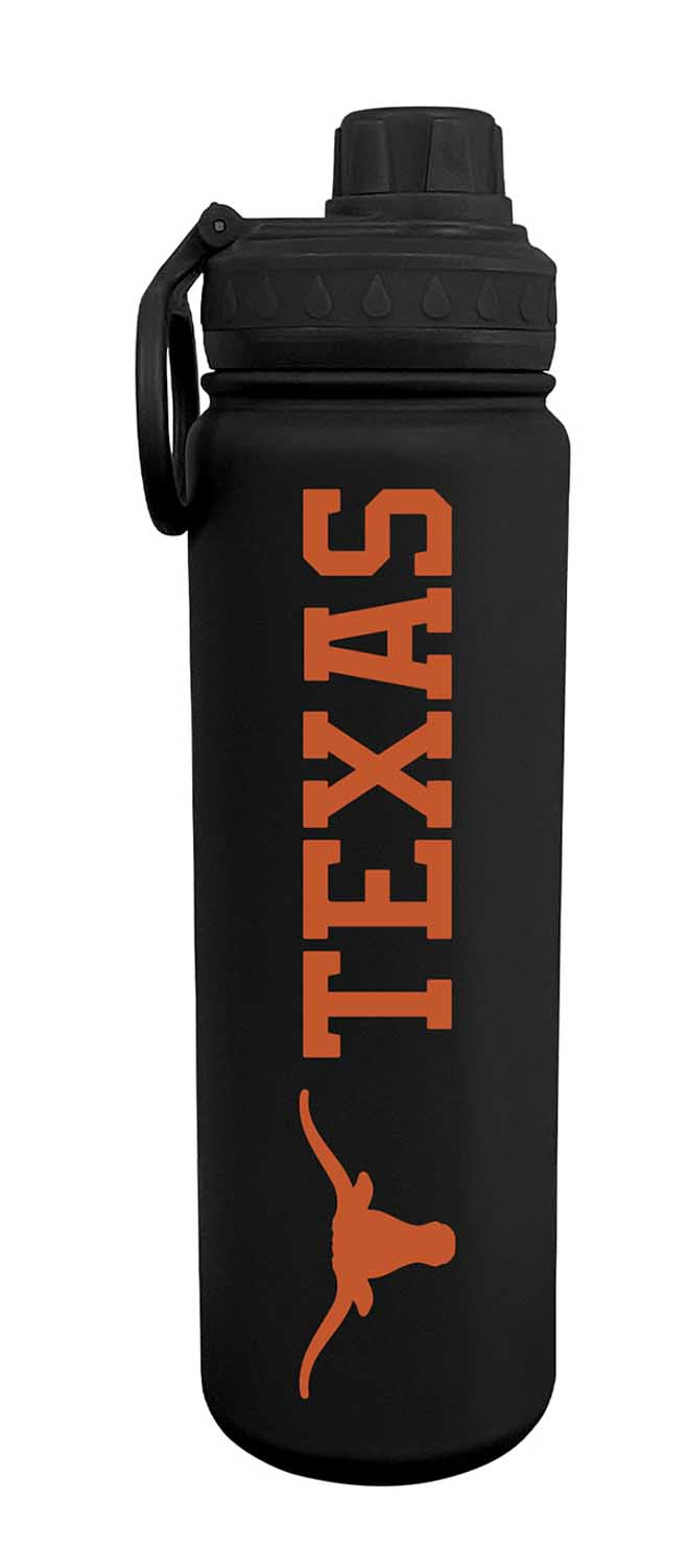 This officially licensed 24oz Texas water bottle is the best accessory for any Texas Longhorns fan. You can use this water bottle 24 oz for water, sports drink, or even to keep your coffee hot. Our vacuum sealed sport bottle ensures that your drinks stay hot or cold for hours. You can bring this bottle along to sport games, hikes, or tailgates on game day. This sport water bottle 24 oz is a slim bottle that fits in most car cup holders for convenience.    This stainless sports water bottle features an easy flow spout for the best drinking experience. The twist on cap features an easy drinking spout to make sipping a breeze. The bottle's lid twists on and off to reveal an easy drinking mouthpiece. The convenience of our double walled water bottles make them perfect for sports and everyday life! Show off your school spirit with this Texas Longhorns water bottle. This durable stainless sports water bottle make the perfect Texas Longhorns accessories for any activity. Our water bottle with clip for backpack is perfect for student campus life and busy alumni activities. Our vacuum sealed water bottles feature a built in handle. The easy grab bottle allows you to sip your water without spilling it on yourself while playing sports or walking to class. The college water bottle is coated in silicone for added grip and softer finish, and the exterior is sweat free so the Texas water bottle won't drip on you.    This insulated water bottle is the perfect birthday or Christmas gift for fans who love to collect Texas stuff. Pair with other Texas novelties or apparel for the ultimate Longhorns gift for women and men. Texas gear is great as birthday gifts for college students, alumni, and sport fans. With our Texas Longhorns water bottle, fans can show team pride and stay hydrated all day and every day!