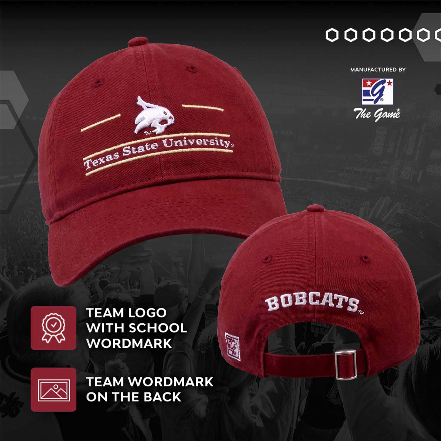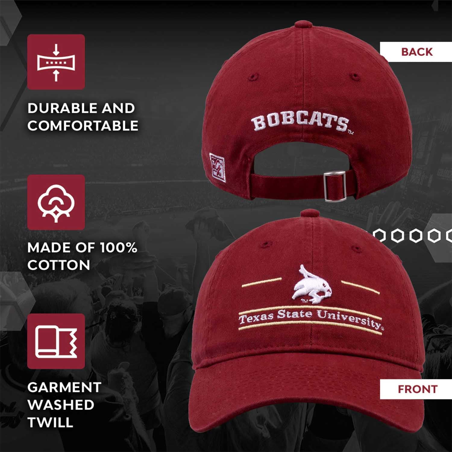 Looking for a way to support your team? Try this Texas State Bobcats game bar hat! These Texas State Bobcats caps are made from 100% garment-washed cotton twill. This Texas State hat also features a relaxed and unstructured design, making it a perfect Texas State Bobcats fitted Bobcats hat. It boldly displays the Texas State Bobcats embroidered logo so you can represent the Texas State. In addition, the Texas State Bobcats logo with the school wordmark is on the front of the hat in a bar design. The team wordmark is on the back of the Bobcats baseball cap. This gameday hat has a metal closure to ensure an adjustable size. Wear these caps for women and men along with your favorite Texas State clothes, clothing & apparel. These ball caps for men and women are the perfect Texas State Bobcats gifts for men. Buy one for yourself, your dad, or any fan. Whether tailgating at Texas State football games or cheering from home, show your team pride by wearing your Texas State gear with your Texas State cap.