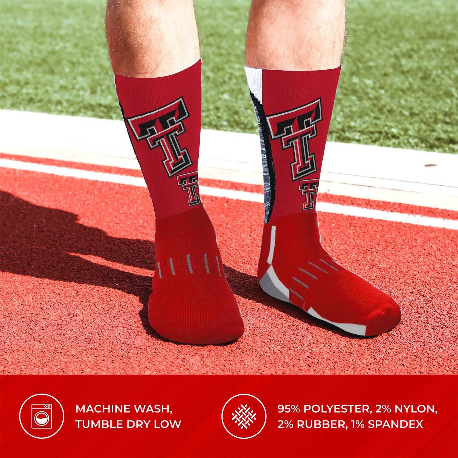 These Texas Tech Red Raiders socks for men and women are great for showing off your Texas Tech pride from head to toe. The unisex socks are comfortable enough to wear to the gym, the game, the tailgate, or nowhere at all. The crew length and poly-spandex blend featuring a supportive formed heel make them a comfortable choice for showcasing your love for your team all year long.     Red Raiders socks pair well with Texas Tech shoes and are great additions to any collection of Texas Tech Red Raiders stuff. Wear them with shorts, your favorite jersey, and Texas Tech shoes for a super fan look, or rock them in the office for an alternative on casual Friday. On a lazy day, wear them with your Texas Tech underwear or pajamas while you put your feet up and enjoy a game on your tv at home.     These Texas Tech crew socks make great gifts for all ages, perfect father's day gift, birthday gift, or holiday stocking stuffers.     The officially-licensed team logo, colors, and graphics make these Texas Tech Red Raiders socks the socks women and men will love forever. Fabric content is 95% polyester, 2% nylon, 2% rubber, and 1% spandex. Machine washable, tumble dry low.