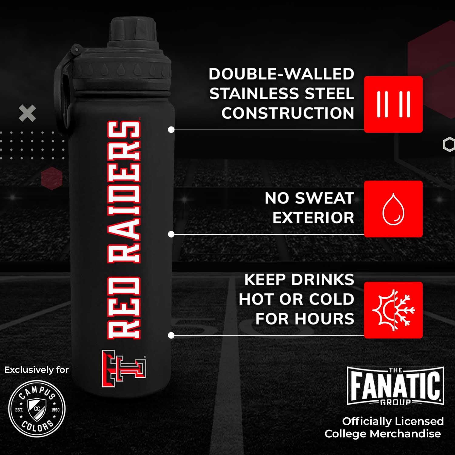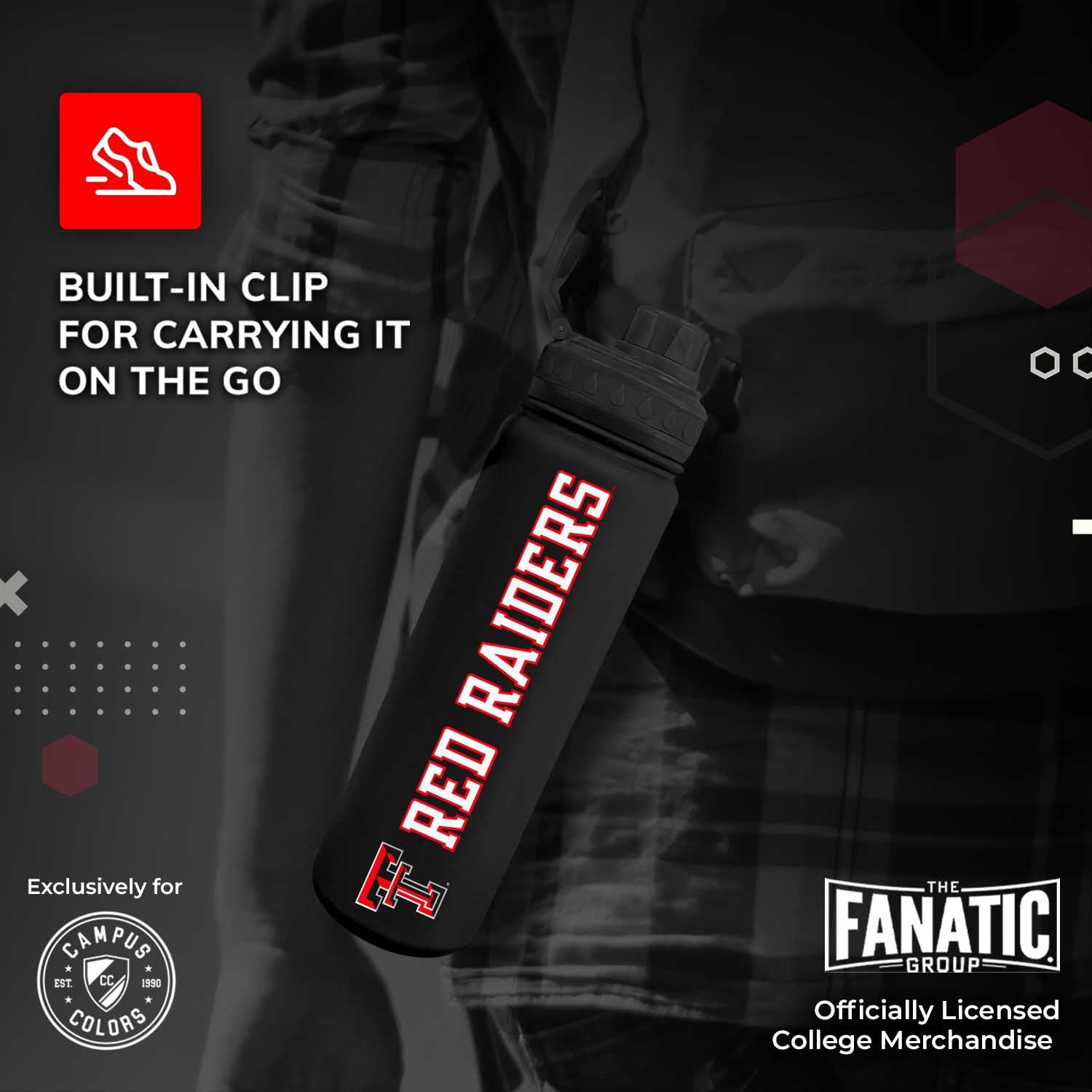 This officially licensed 24oz Texas Tech water bottle is the best accessory for any Texas Tech Red Raiders fan. You can use this water bottle 24 oz for water, sports drink, or even to keep your coffee hot. Our vacuum sealed sport bottle ensures that your drinks stay hot or cold for hours. You can bring this bottle along to sport games, hikes, or tailgates on game day. This sport water bottle 24 oz is a slim bottle that fits in most car cup holders for convenience.    This stainless sports water bottle features an easy flow spout for the best drinking experience. The twist on cap features an easy drinking spout to make sipping a breeze. The bottle's lid twists on and off to reveal an easy drinking mouthpiece. The convenience of our double walled water bottles make them perfect for sports and everyday life! Show off your school spirit with this Texas Tech Red Raiders water bottle. This durable stainless sports water bottle make the perfect Texas Tech Red Raiders accessories for any activity. Our water bottle with clip for backpack is perfect for student campus life and busy alumni activities. Our vacuum sealed water bottles feature a built in handle. The easy grab bottle allows you to sip your water without spilling it on yourself while playing sports or walking to class. The college water bottle is coated in silicone for added grip and softer finish, and the exterior is sweat free so the Texas Tech water bottle won't drip on you.    This insulated water bottle is the perfect birthday or Christmas gift for fans who love to collect Texas Tech stuff. Pair with other Texas Tech novelties or apparel for the ultimate Red Raiders gift for women and men. Texas Tech gear is great as birthday gifts for college students, alumni, and sport fans. With our Texas Tech Red Raiders water bottle, fans can show team pride and stay hydrated all day and every day!