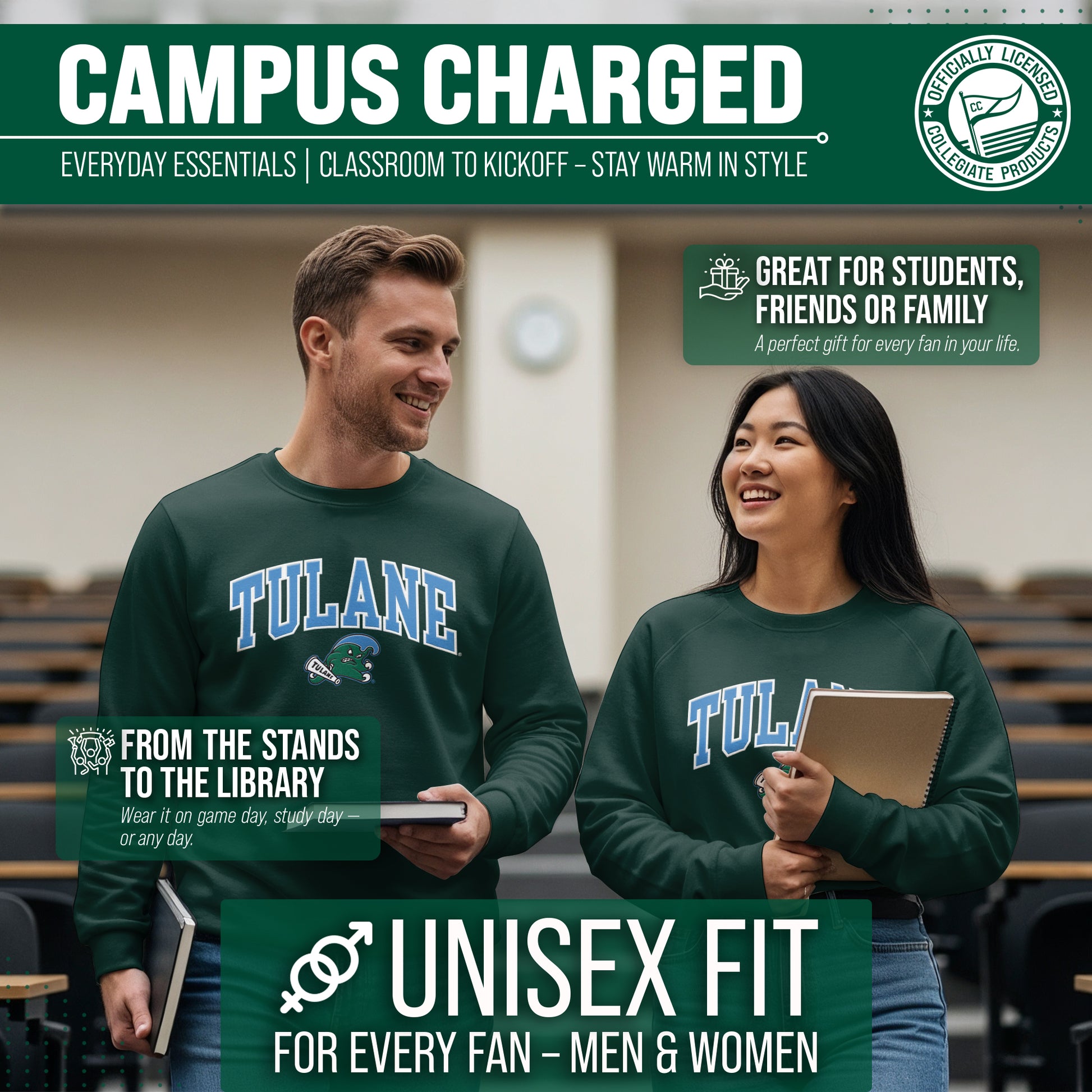 The Tulane Green Wave Adult Tackle Twill Crewneck Sweatshirt is super comfortable, runs true to size, and is great for showing off your school pride. All crewneck pullovers are a fan favorite and look fresh after many years. The Green Wave crewneck sweatshirt has a unisex fit that is ideal for both men and women. The embroidered university logo and name will stay crisp wear after wear. Our college crewneck sweatshirt is ideal when thrown over a t-shirt for football tailgates, games, when the temperature drops, or when you just want to show off your team spirit! The university crewneck sweatshirt is the perfect gift for any college student, upcoming graduate, alumnus or sports fan. Made with quality material, the double letter embroidered university logo is made of precise laser cut appliques applied with heat that will stay crisp wear after wear. All logos and colors are NCAA officially licensed. Our Tulane Green Wave crewneck is essential collegiate apparel for showing off your school or team pride. Lightweight college crewneck sweatshirt is made from a dual blend of 50% cotton and 50% polyester that is ideal for that tailgate or game day when the temperature drops. Cheer on your Green Wave in style!