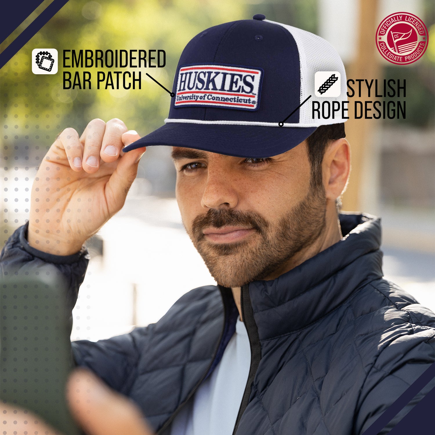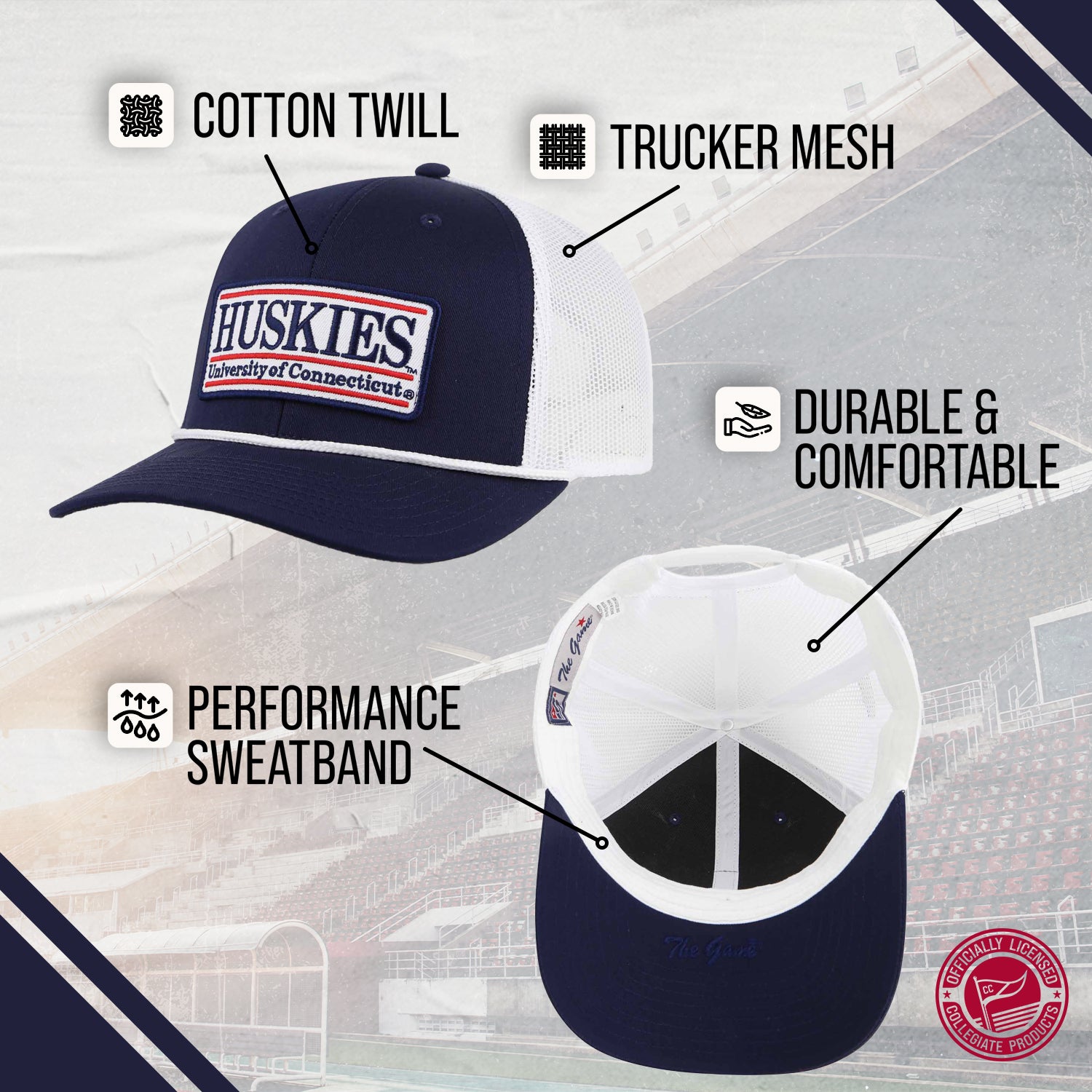 Elevate Your hat game with this UCONN Huskies Elite Everyday Trucker Hat! Whether you're heading to a game, running errands, or just having a casual day out, our Huskies trucker hat is the perfect accessory. Made with soft and breathable mesh material, this cap will keep your head cool and comfortable all day long. The one size fits most and adjustable snapback closure ensures a secure and cozy fit for both men and women. But it's not just about style - our hat also features a performance sweatband that wicks away moisture to keep you dry during any activity. And with its custom embroidered patch and rope detail showcasing your favorite NCAA team, you can proudly represent them wherever you go. With its versatile design and friendly fit, our everyday trucker hat is suitable for any occasion. So why settle for ordinary hats when you can upgrade to this rope trucker hat? Grab yours now and show off your team spirit in style!