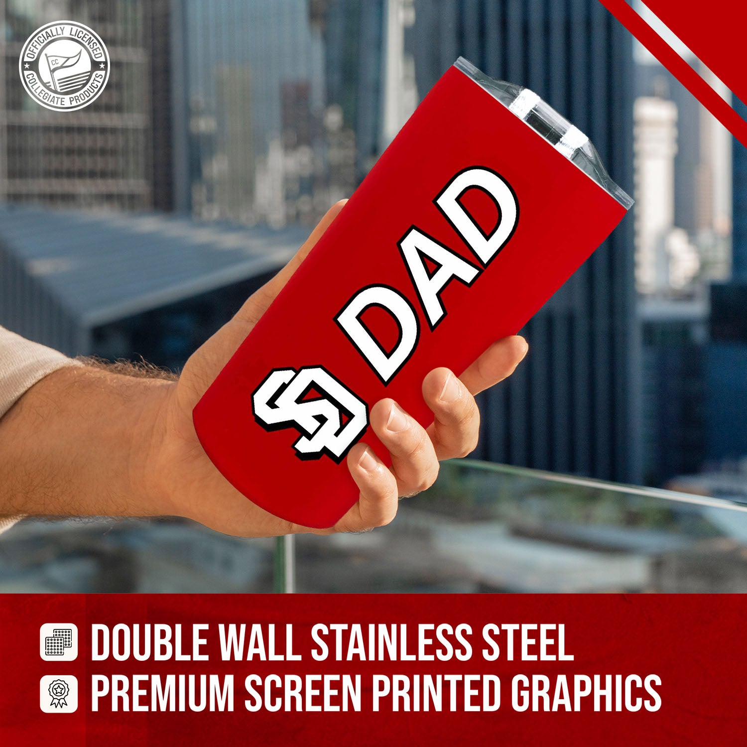 Our stainless steel tumbler mugs for dad are designed for constant use in any type of setting! At a sports game? These insulated tumblers are compact and can fit in most cup holders. On the move? Our contoured spout makes it easy to sip on the go! Your tumbler is there to compliment your South Dakota sweatshirt when you need to stay warm and there when you're looking for an ice-cold refreshment. No matter the setting, show your school and dad pride while properly and efficiently preserving the desired temperature of your beverage! This University of South Dakota Coyotes DAD travel mug also makes a great gift if you're looking to give your dad, step dad, or father figure in your life a present! All of our products feature the official team colors, logos and lettering. We don't skimp on quality in any way. The colors are always vibrant and the graphics are always accurate and brimming with team spirit. Let everyone know you're a cool dad and get this dad tumbler today!