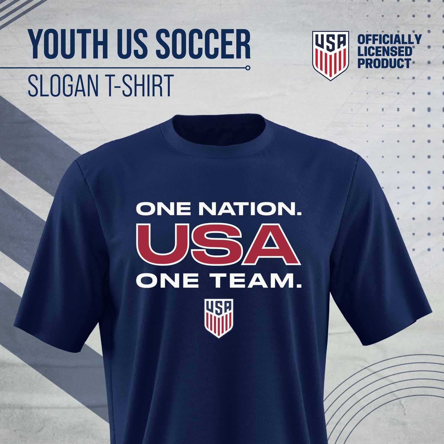 The Officially Licensed Unisex Team USA Soccer Youth Slogan T-Shirt is perfect for showing off your young soccer fan's national pride and support for Team USA! This unisex USA Soccer shirt is made from a 100% ringspun cotton to ensure comfort and durability. It features a vivid, front-and-center graphic with the ‘One Nation, One Team’ slogan. Help your kiddo show their love and support for the US women's or men's national soccer team with this stylish and eye catching adult USA soccer shirt, perfect as a gift to your child, family member, or any young soccer fan! Gear up with this officially licensed USA Soccer tshirt apparel and show your love for Team USA! Share your child's love of US Soccer during the next game with this tee!