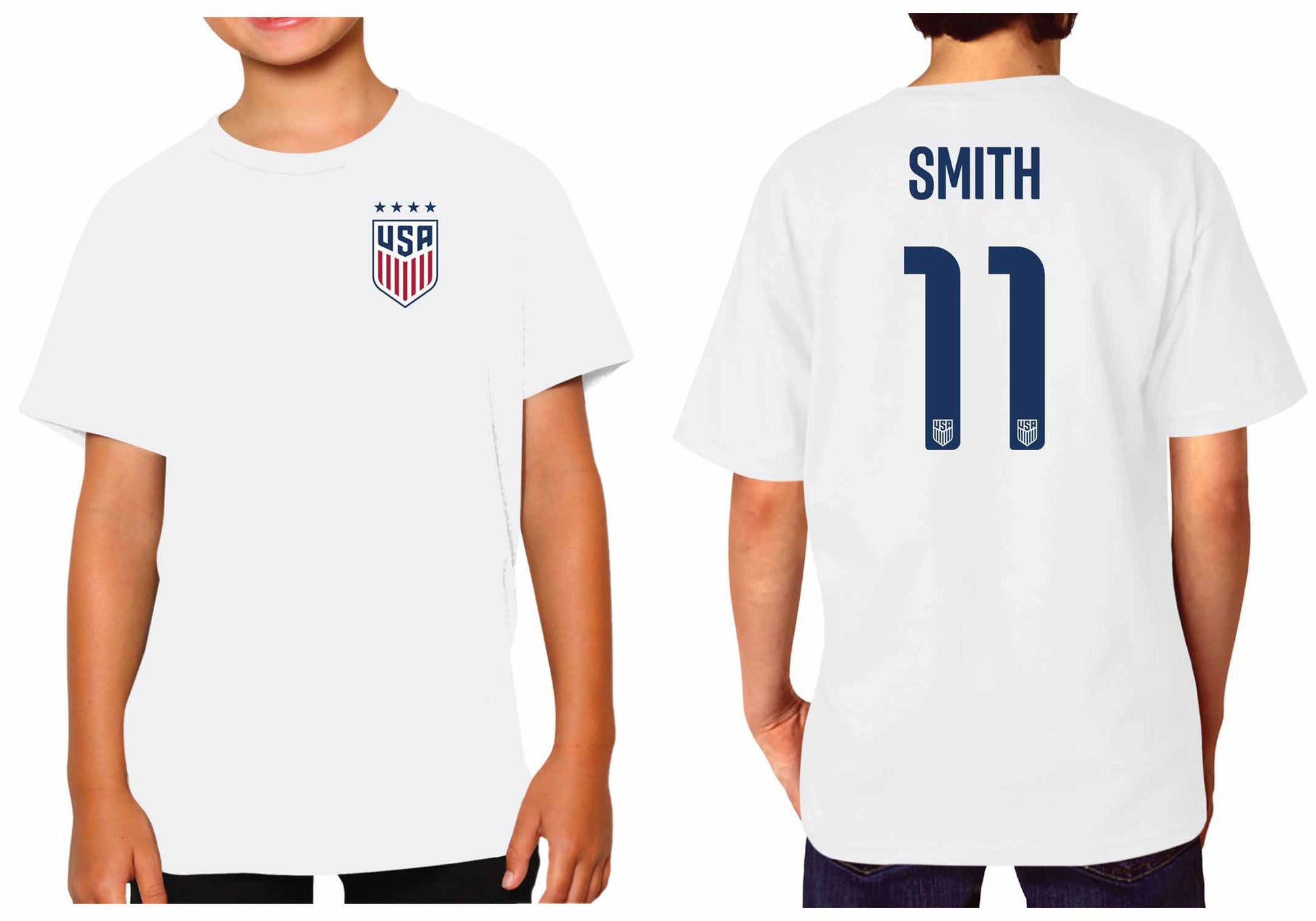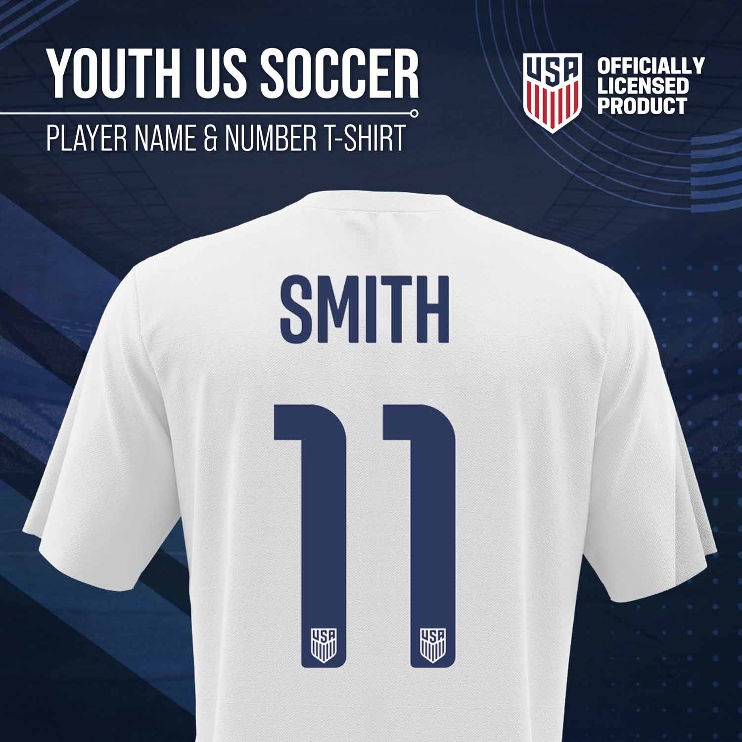 Introducing the Official Licensed Youth USA Women Soccer Name and Number USWNT T-Shirt. Show your national pride and support for the USA Women's Soccer team with this jersey tshirt featuring a logo on the upper left chest, player name and number on the back. The Officially Licensed Youth Name and Number USA Women's Soccer Team USA Soccer t shirt provides a vivid, screen printed design and player team jersey replication! This youth USA Women soccer apparel tshirt is made from a 100% ringspun cotton, tag-free and fits comfortably. The Officially Licensed USA soccer tshirt jersey apparel is the perfect way to show off your love and support for the US Womens national soccer team. Gear up with Team USA Womens apparel! Show your support for Team USA Soccer with a youth USA Womens soccer name and number jersey shirt; perfect as a gift to a teammate, classmate, fellow camper or friend! Show your support by wearing a USA Women's soccer youth name and number tee!
