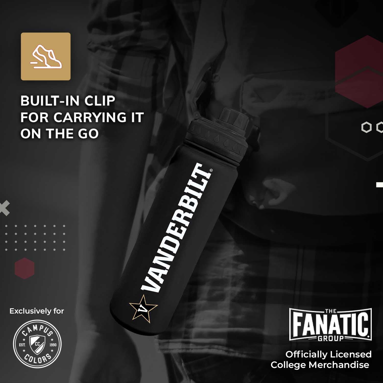 This officially licensed 24oz Vanderbilt water bottle is the best accessory for any Vanderbilt Commodores fan. You can use this water bottle 24 oz for water, sports drink, or even to keep your coffee hot. Our vacuum sealed sport bottle ensures that your drinks stay hot or cold for hours. You can bring this bottle along to sport games, hikes, or tailgates on game day. This sport water bottle 24 oz is a slim bottle that fits in most car cup holders for convenience. This stainless sports water bottle features an easy flow spout for the best drinking experience. The twist on cap features an easy drinking spout to make sipping a breeze. The bottle's lid twists on and off to reveal an easy drinking mouthpiece. The convenience of our double walled water bottles make them perfect for sports and everyday life! Show off your school spirit with this Vanderbilt Commodores water bottle. This durable stainless sports water bottle make the perfect Vanderbilt Commodores accessories for any activity. Our water bottle with clip for backpack is perfect for student campus life and busy alumni activities. Our vacuum sealed water bottles feature a built in handle. The easy grab bottle allows you to sip your water without spilling it on yourself while playing sports or walking to class. The college water bottle is coated in silicone for added grip and softer finish, and the exterior is sweat free so the Vanderbilt water bottle won't drip on you. This insulated water bottle is the perfect birthday or Christmas gift for fans who love to collect Vanderbilt stuff. Pair with other Vanderbilt novelties or apparel for the ultimate Commodores gift for women and men. Vanderbilt gear is great as birthday gifts for college students, alumni, and sport fans. With our Vanderbilt Commodores water bottle, fans can show team pride and stay hydrated all day and every day!