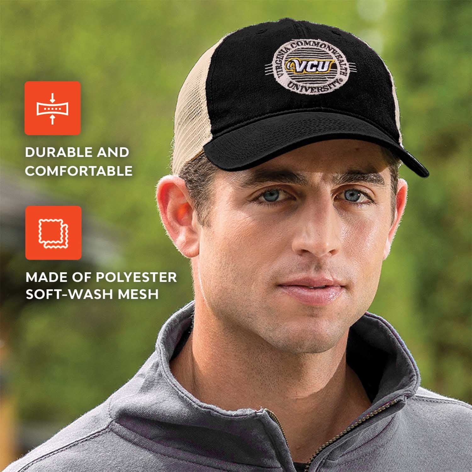 This VCU Rams hat is the perfect Rams fan gift. It features a VCU Rams school seal on the front, with frayed edges for a vintage flair. In a stylish script, the team wordmark is on the back of this VCU baseball cap. The unstructured relaxed fit and adjustable snapback closure make this VCU Rams cap comfortable for any fan. This mesh-back hat is also size adjustable, making these Rams hats excellent VCU gifts for any fan. This VCU hat is made from durable polyester soft-wash mesh and is perfect for those hot summer days. The comfortable fit & design ensure these college hats will not go out of style. Wear this baseball cap with VCU Rams women's apparel or VCU Rams apparel for men. Support your favorite team by wearing your VCU Rams hat. Whether you are cheering on the team at a football game or at home, you can represent your team in this vintage baseball cap.