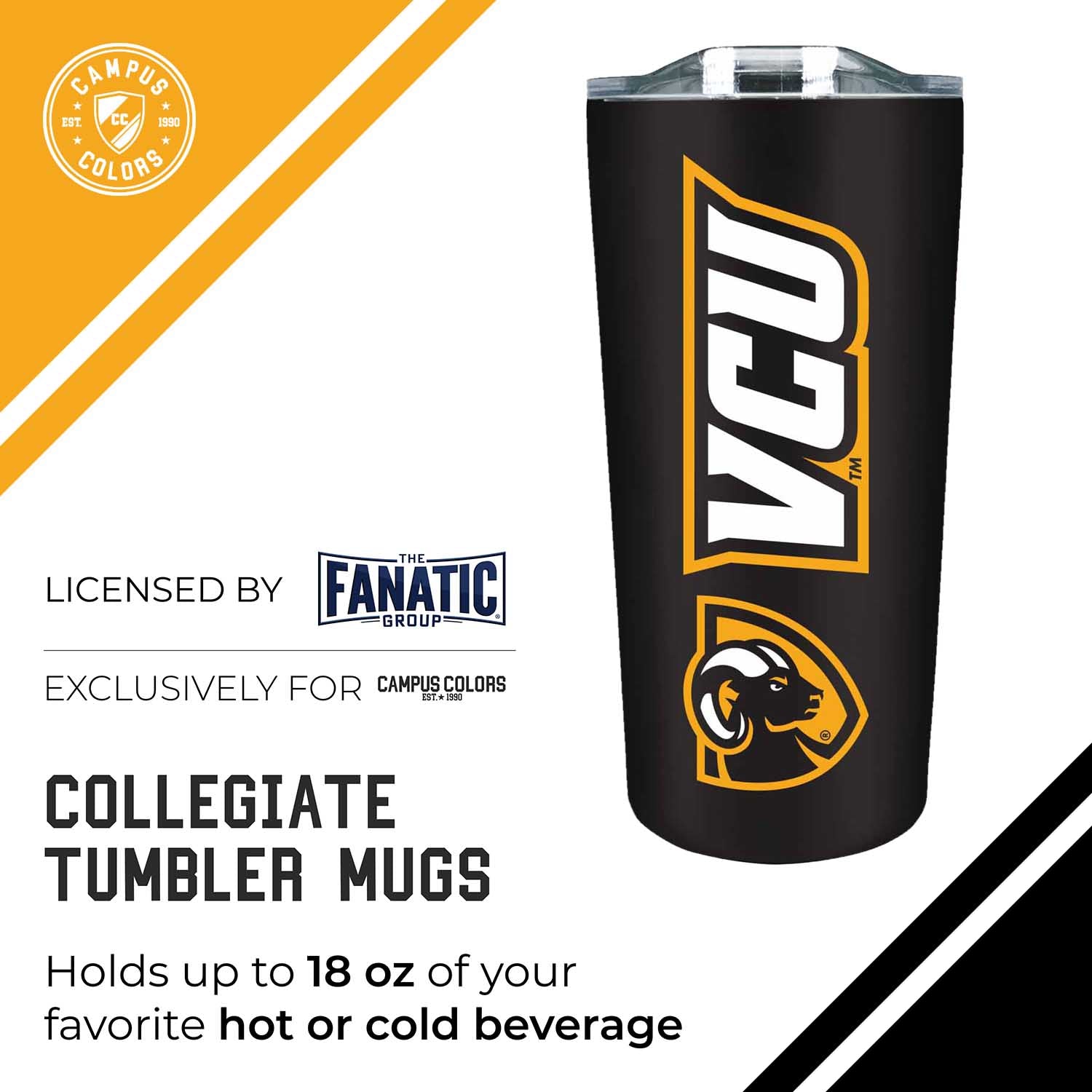 Our stainless steel tumbler mugs are designed for constant use in any type of setting! At a sports game? These insulated tumblers are compact and can fit in most cup holders. On the move? Our contoured spout makes it easy to sip on the go! Your tumbler is there to compliment your VCU sweatshirt when you need to stay warm and there when you're looking for an ice-cold refreshment. No matter the setting, show your school pride while properly and efficiently preserving the desired temperature of your beverage! This VCU Rams travel mug also makes a great gift if you're looking to give someone a cool Rams novelty, this VCU Rams travel mug compliments any kind of Rams apparel. Combine the VCU water bottle with a VCU pillow, a VCU face mask, and a VCU blanket and give a whole haul of Rams gear to your favorite VCU Rams alumni! All of our products feature the official team colors, logos and lettering. We don't skimp on quality in any way. The colors are always vibrant and the graphics are always accurate and brimming with team spirit.