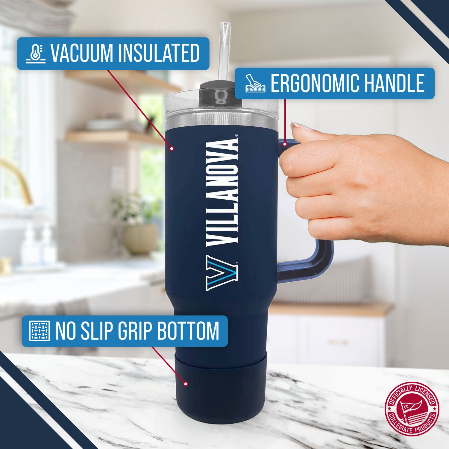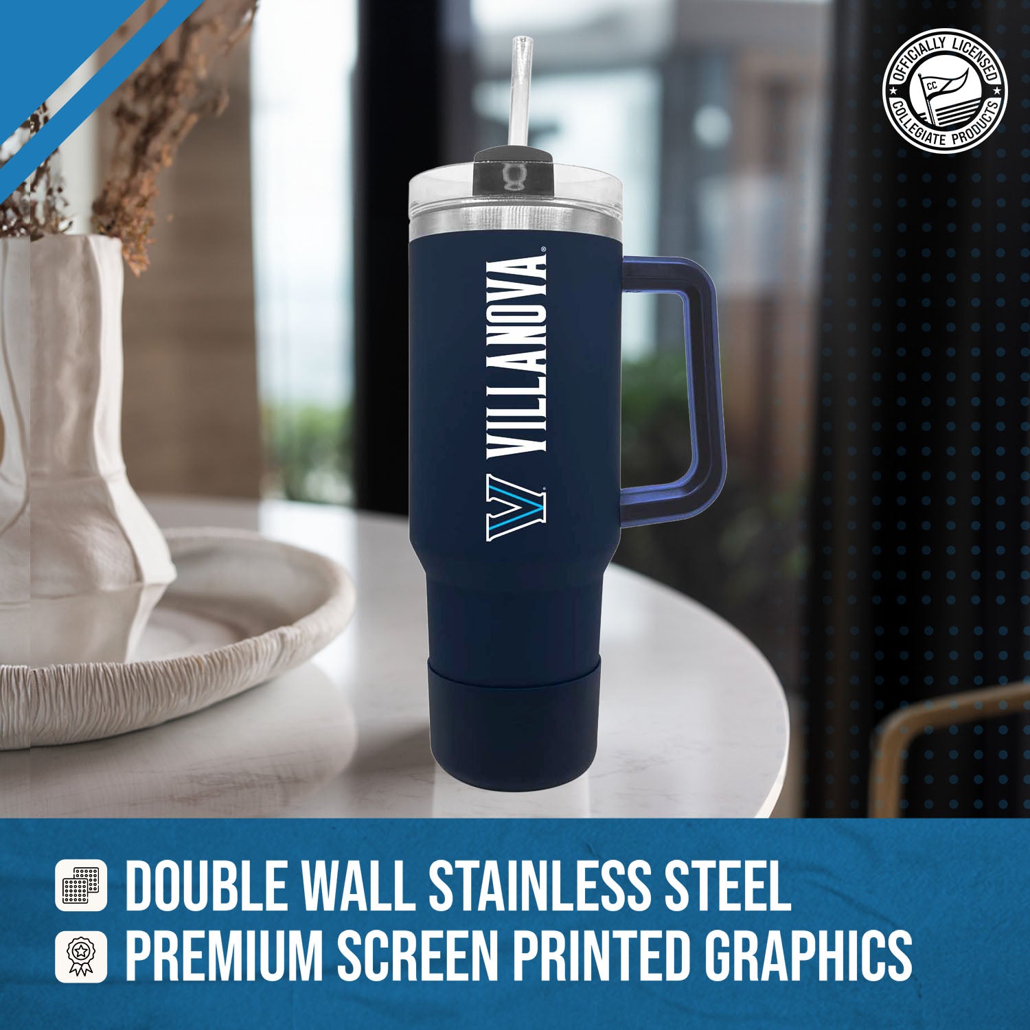 Our stainless steel 40 oz tumblers with handle and straw are designed for constant use in any type of setting! At a sports game? These insulated tumblers are compact and can fit in most cup holders and even feature a no slip grip on the bottom to keep condensation away! On the move? Our contoured spout or straw options makes it easy to sip on the go! No matter the setting, show your school pride while properly and efficiently preserving the desired temperature of your beverage! This Villanova Wildcats travel tumbler also makes a great gift! Combine the 40 oz Villanova tumbler with a Villanova pillow or a Villanova blanket and give a whole haul of Wildcats gear to your favorite alumni! All of our products feature the officially licensed team colors, logos and lettering. We don't skimp on quality in any way. The colors are always vibrant and the graphics are always accurate and brimming with team spirit.