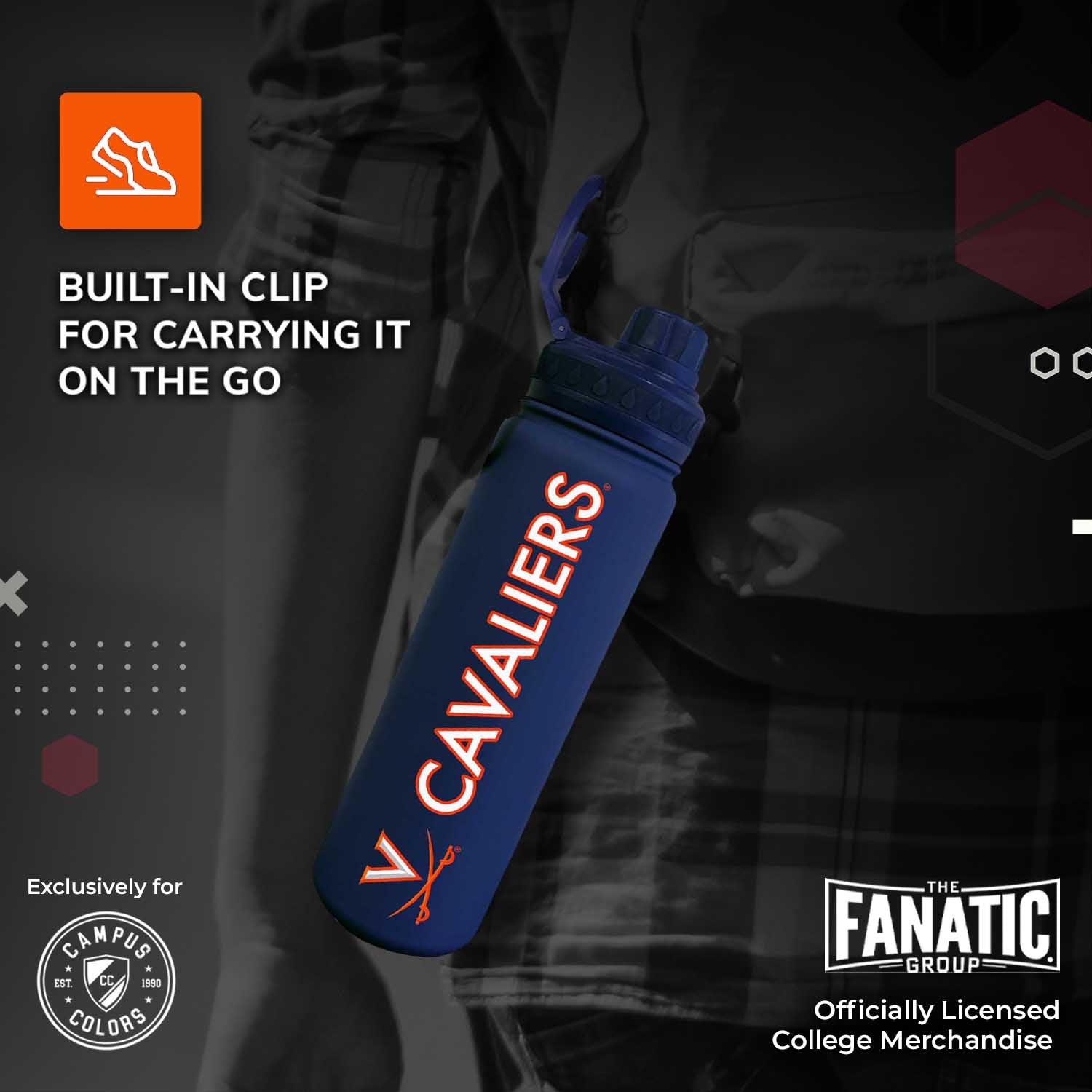 This officially licensed 24oz Virginia water bottle is the best accessory for any Virginia Cavaliers fan. You can use this water bottle 24 oz for water, sports drink, or even to keep your coffee hot. Our vacuum sealed sport bottle ensures that your drinks stay hot or cold for hours. You can bring this bottle along to sport games, hikes, or tailgates on game day. This sport water bottle 24 oz is a slim bottle that fits in most car cup holders for convenience. This stainless sports water bottle features an easy flow spout for the best drinking experience. The twist on cap features an easy drinking spout to make sipping a breeze. The bottle's lid twists on and off to reveal an easy drinking mouthpiece. The convenience of our double walled water bottles make them perfect for sports and everyday life! Show off your school spirit with this Virginia Cavaliers water bottle. This durable stainless sports water bottle make the perfect Virginia Cavaliers accessories for any activity. Our water bottle with clip for backpack is perfect for student campus life and busy alumni activities. Our vacuum sealed water bottles feature a built in handle. The easy grab bottle allows you to sip your water without spilling it on yourself while playing sports or walking to class. The college water bottle is coated in silicone for added grip and softer finish, and the exterior is sweat free so the Virginia water bottle won't drip on you. This insulated water bottle is the perfect birthday or Christmas gift for fans who love to collect Virginia stuff. Pair with other Virginia novelties or apparel for the ultimate Cavaliers gift for women and men. Virginia gear is great as birthday gifts for college students, alumni, and sport fans. With our Virginia Cavaliers water bottle, fans can show team pride and stay hydrated all day and every day!