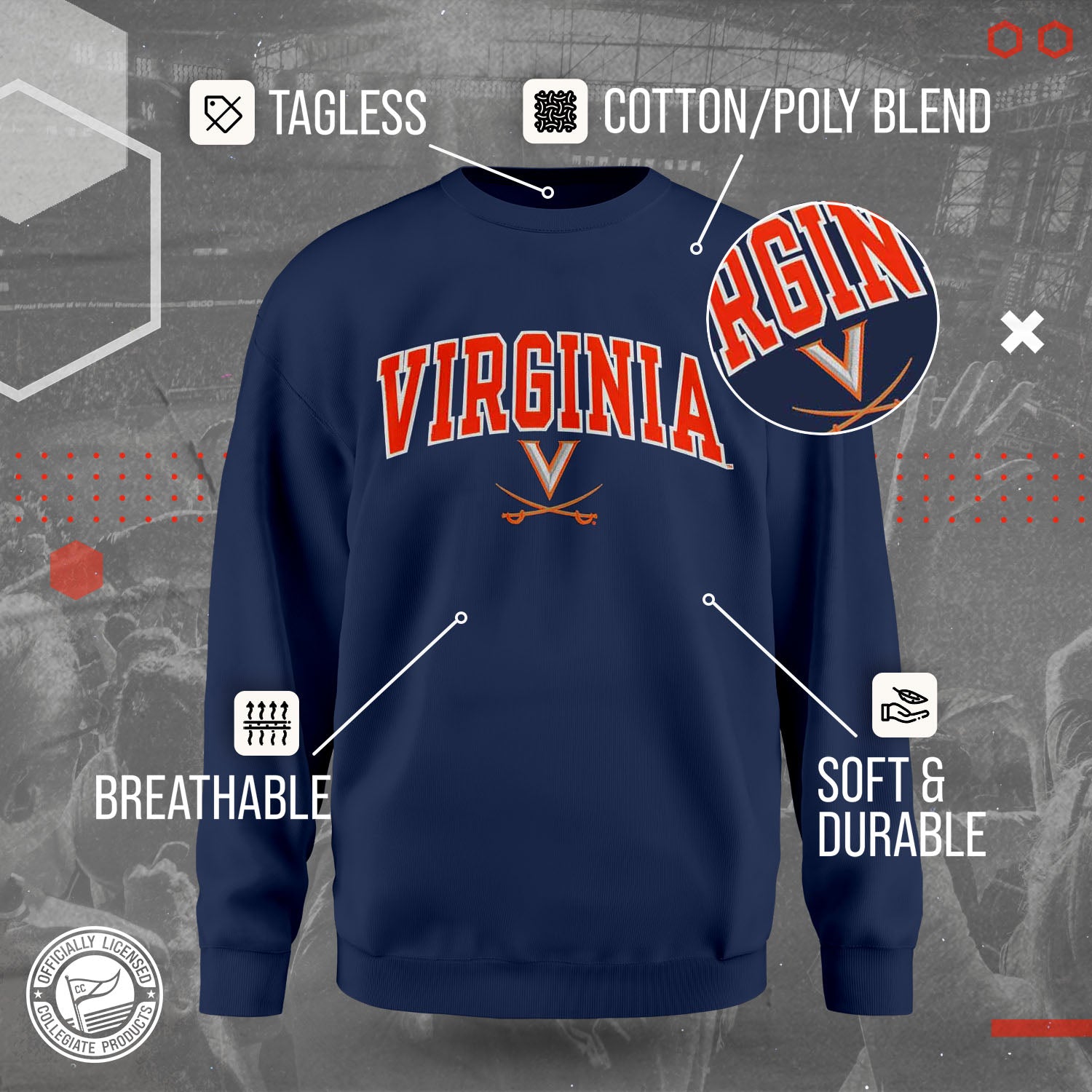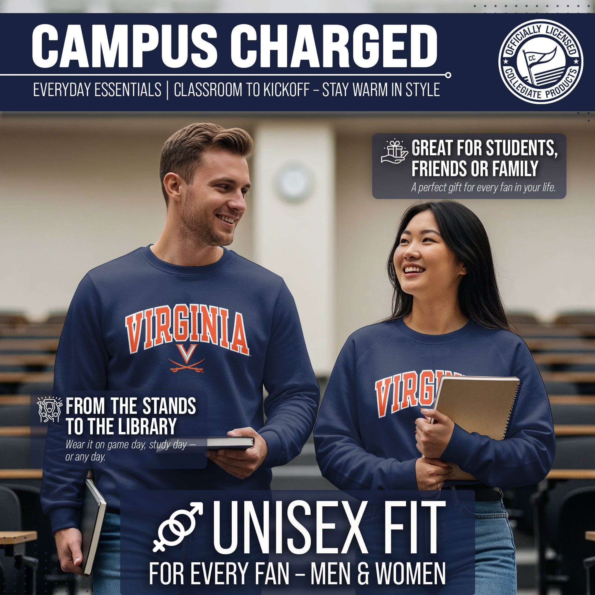 The Virginia Cavaliers Adult Tackle Twill Crewneck Sweatshirt is super comfortable, runs true to size, and is great for showing off your school pride. All crewneck pullovers are a fan favorite and look fresh after many years. The Cavaliers crewneck sweatshirt has a unisex fit that is ideal for both men and women. The embroidered university logo and name will stay crisp wear after wear. Our college crewneck sweatshirt is ideal when thrown over a t-shirt for football tailgates, games, when the temperature drops, or when you just want to show off your team spirit! The university crewneck sweatshirt is the perfect gift for any college student, upcoming graduate, alumnus or sports fan. Made with quality material, the double letter embroidered university logo is made of precise laser cut appliques applied with heat that will stay crisp wear after wear. All logos and colors are NCAA officially licensed. Our Virginia Cavaliers crewneck is essential collegiate apparel for showing off your school or team pride. Lightweight college crewneck sweatshirt is made from a dual blend of 50% cotton and 50% polyester that is ideal for that tailgate or game day when the temperature drops. Cheer on your Cavaliers in style!