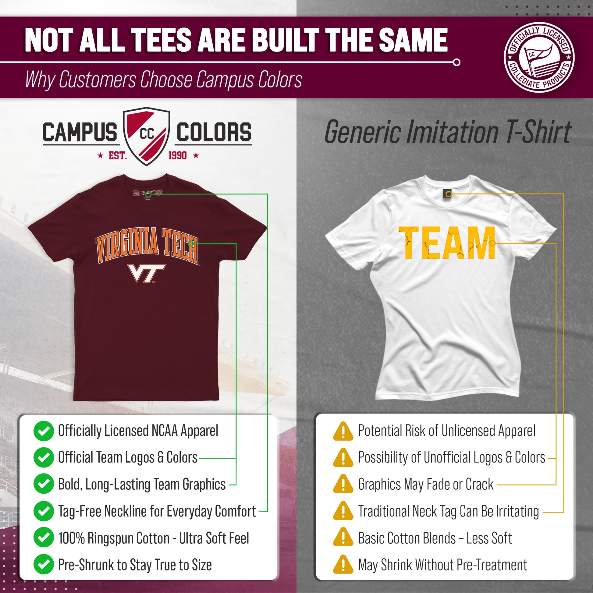 Score with Campus Colors, the ultimate destination for officially licensed college apparel for men and women. Design and printed in the USA, we use only the highest quality screen printing techniques to bring you the most comfortable, durable, and stylish clothing possible. Go ahead and show your team pride at the big game or any time! This premium-quality Gameday t-shirt fits both male and female adults and comes in small, medium, large, XL, and XXL. So needless to say, it fits Virginia Tech Hokies fans of all types! Maybe you aren't a Virginia Tech fan but you know someone who is? Don't worry! This high-quality t-shirt is soft, lightweight, breathable and a GREAT gift for any birthday, anniversary, Father's Day, Mother's day, you name it! So, if you want to stand out as the #1 Hokies fan at the next big tailgate party, homecoming parade, or watch party, you're going to want to be wearing one of these Gameday t-shirts.