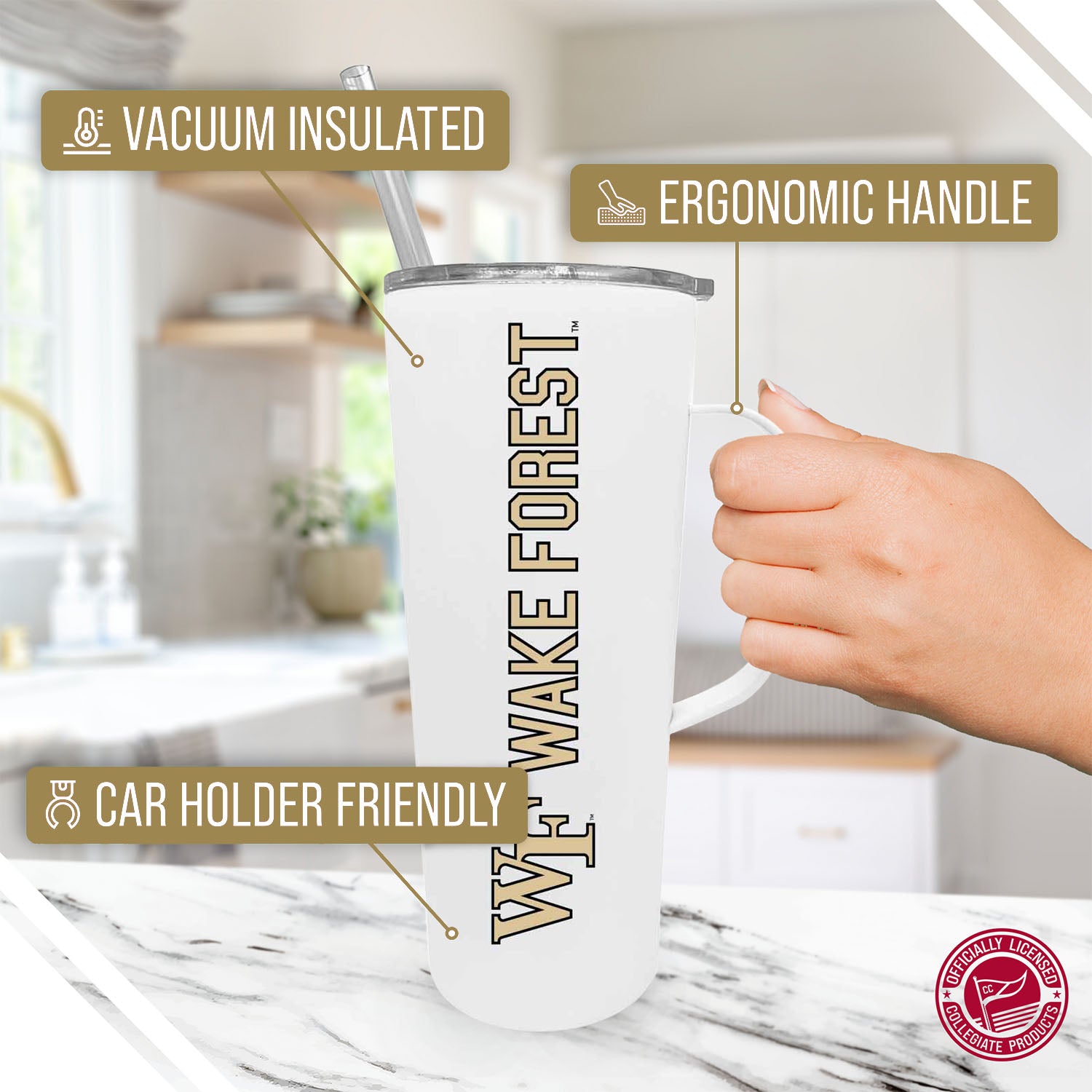 Introducing the ultimate accessory for Demon Deacons fans or busy individuals on the go, the NCAA Stainless Steal 20oz Roadie With Handle & Dual Option Lid With Straw! This tumbler is designed to keep you hydrated and stylish throughout your day, whether you're heading to class, cheering on your favorite team, or running errands. Crafted from durable stainless steel, this soft-touch tumbler is perfect for holding your favorite hot or cold beverages. The handle provides a comfortable grip, while the dual-option lid allows you to sip from the straw or drink directly from the tumbler. Designed for convenience, this travel tumbler is hand wash recommended and cup holder friendly! The included straw allows you to enjoy your drinks on the go without worrying about spills. What sets this tumbler apart is its officially licensed design! This Wake Forest Demon Deacons tumbler is the perfect accessory for tailgates or everyday use. Stay hydrated, show your team pride, & enjoy your drinks in style!