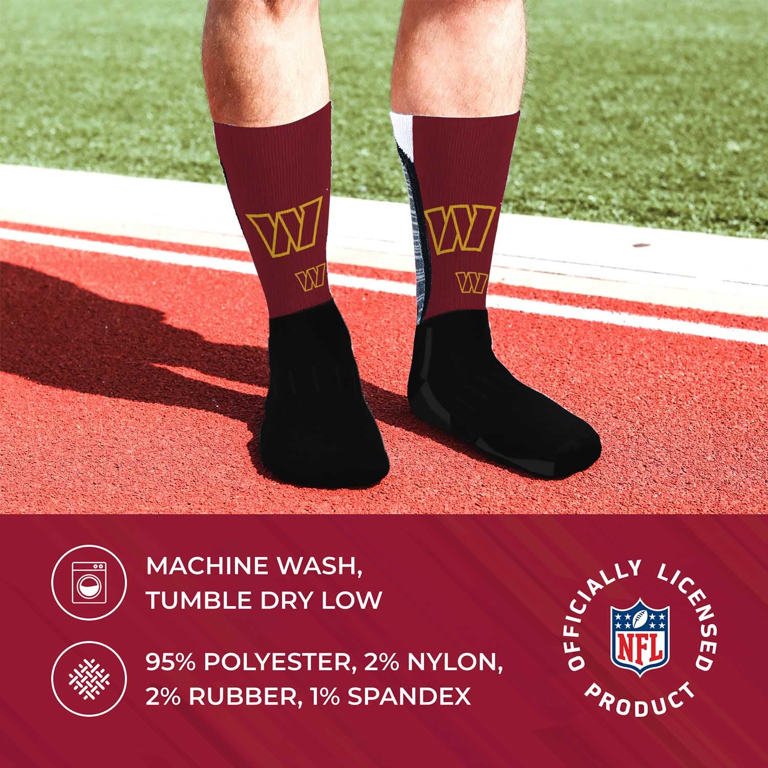 These Washington Commanders socks for children are great for showing off your Washington pride from head to toe. The unisex Washington youth socks are comfortable. The crew length and poly-spandex blend featuring a supportive formed heel make them a comfortable choice for showcasing your love for your team all year long. Washington youth socks are great additions to a collection of Washington Commanders stuff. Wear them with shorts, your favorite jersey, and Washington Commanders shoes for a superfan look, or rock them in the office for an alternative to argyle on casual friday. On a lazy day, wear them with your underwear or pajamas and Washington Commanders house shoes while you put your feet up and enjoy a game in the house. Washington Commanders youth socks make great birthday gifts for all ages. The officially-licensed team logo, colors, and graphics make these socks the Washington socks kid superfans will love. Fabric content is 95% polyester, 2% nylon, 2% rubber, and 1% spandex. Machine washable, tumble dry low.