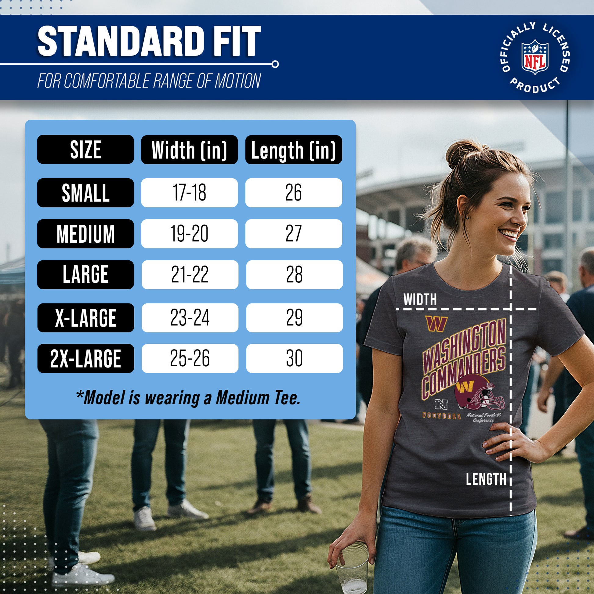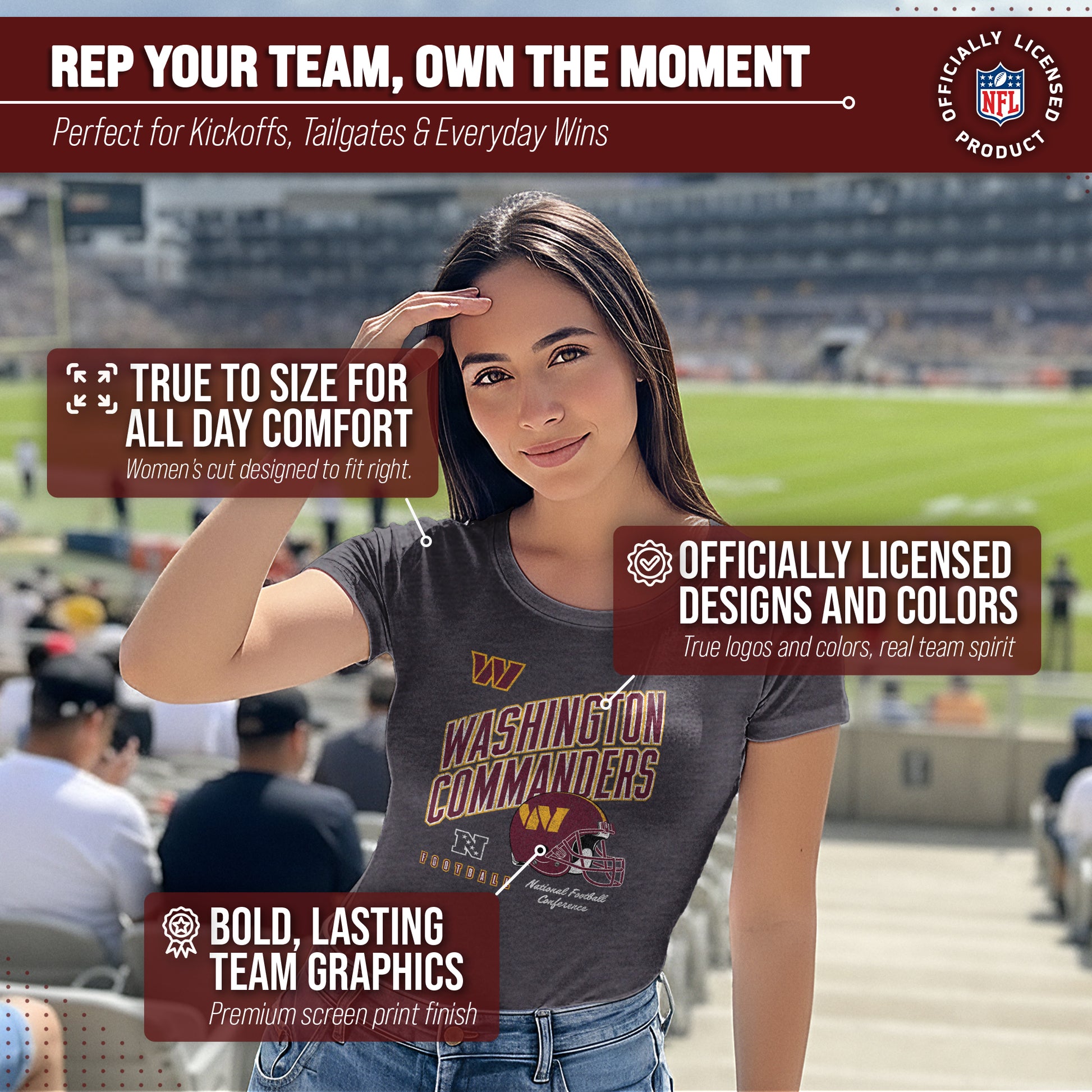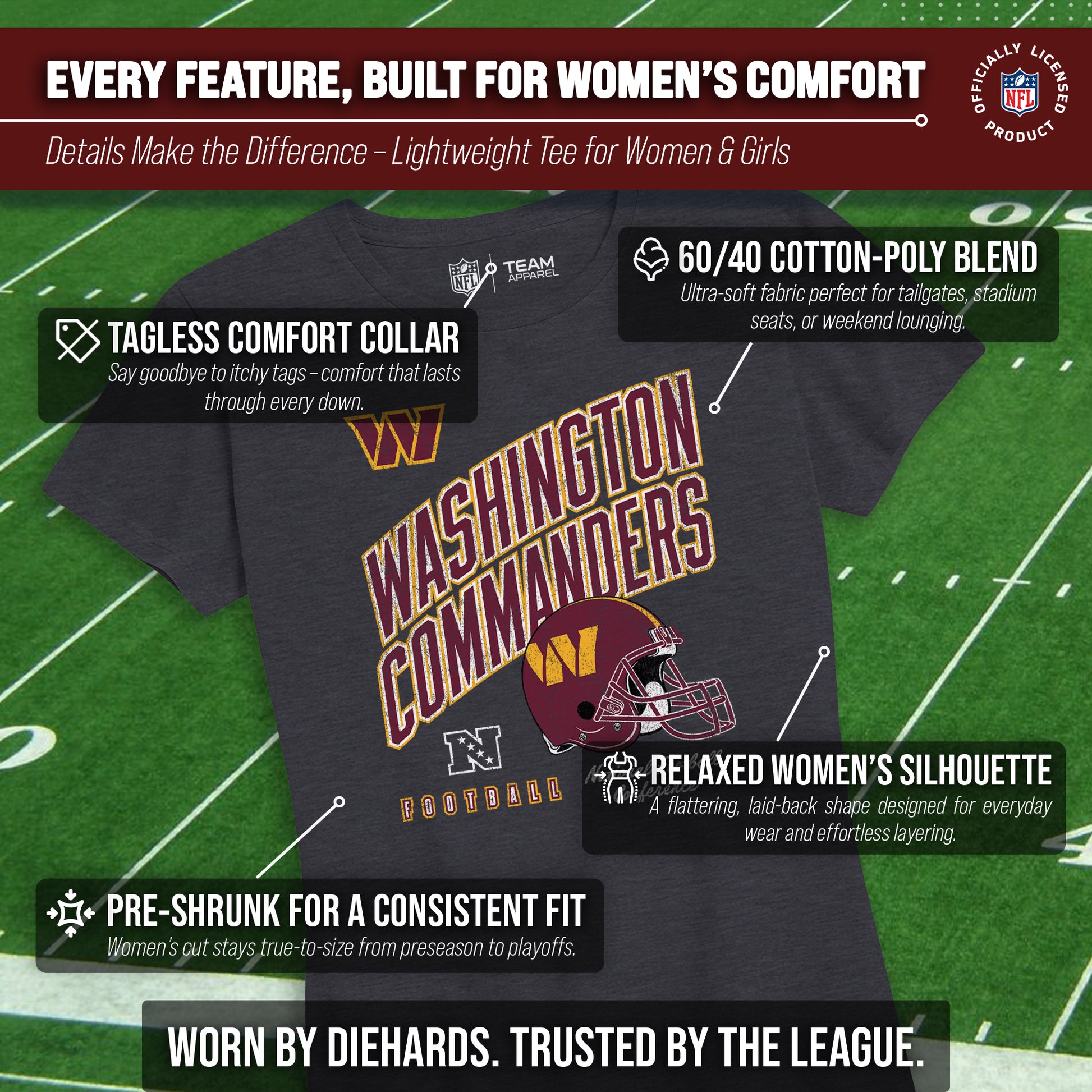 Calling all ladies! Get ready to rock game day with the Women's Team Fan Apparel Distressed Helmet T-Shirt! This comfortable and stylish Washington Commanders womens tee is perfect for any female football fan, whether you're cheering on your favorite team at the stadium or watching from home. Made from a super soft cotton fabric , this shirt will keep you cool and comfortable all game long. The helmet, team name, team logo and official team color adds a touch of retro flair, while the tag-less design ensures itch-free wear. Whether you're a die-hard fan or just love a good simple look, this shirt is perfect for showing off your team spirit. Available in a wide range of women's sizes, it's suitable for all shapes and sizes! So grab your girlfriends and get ready to cheer on your team in style with the Women's Team Fan Apparel Distressed Helmet T-Shirt!