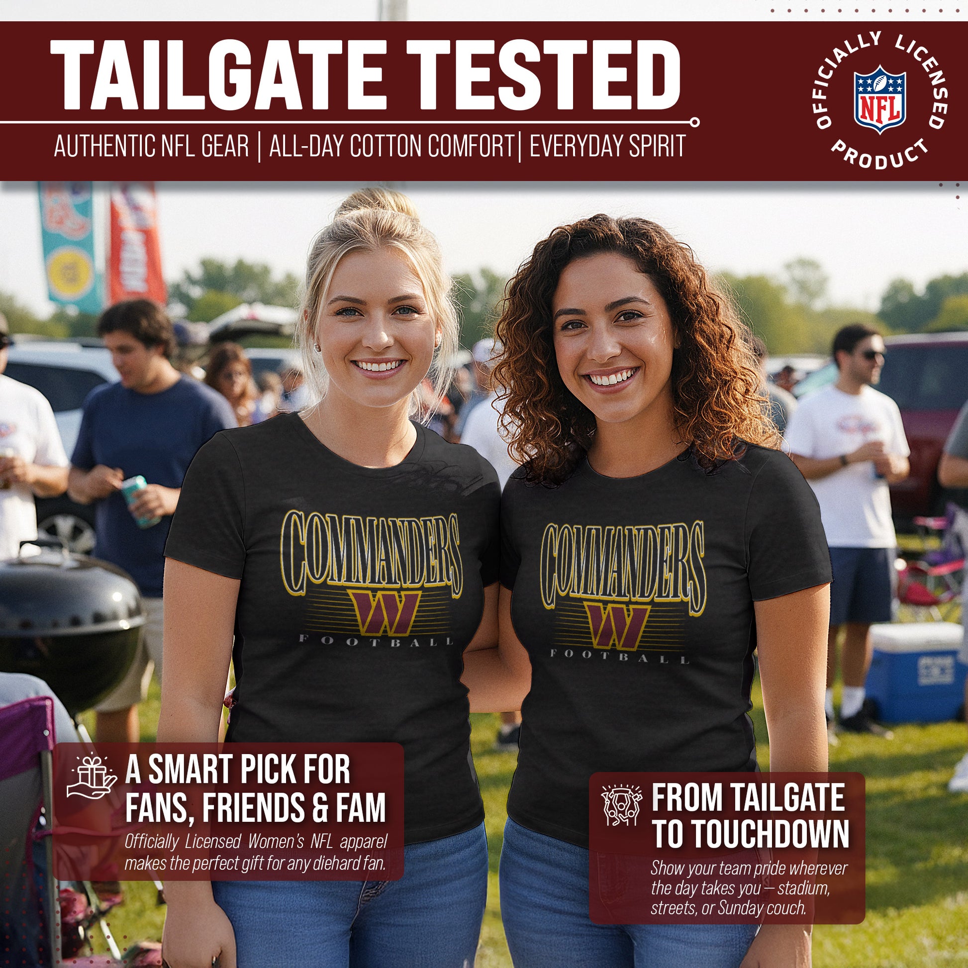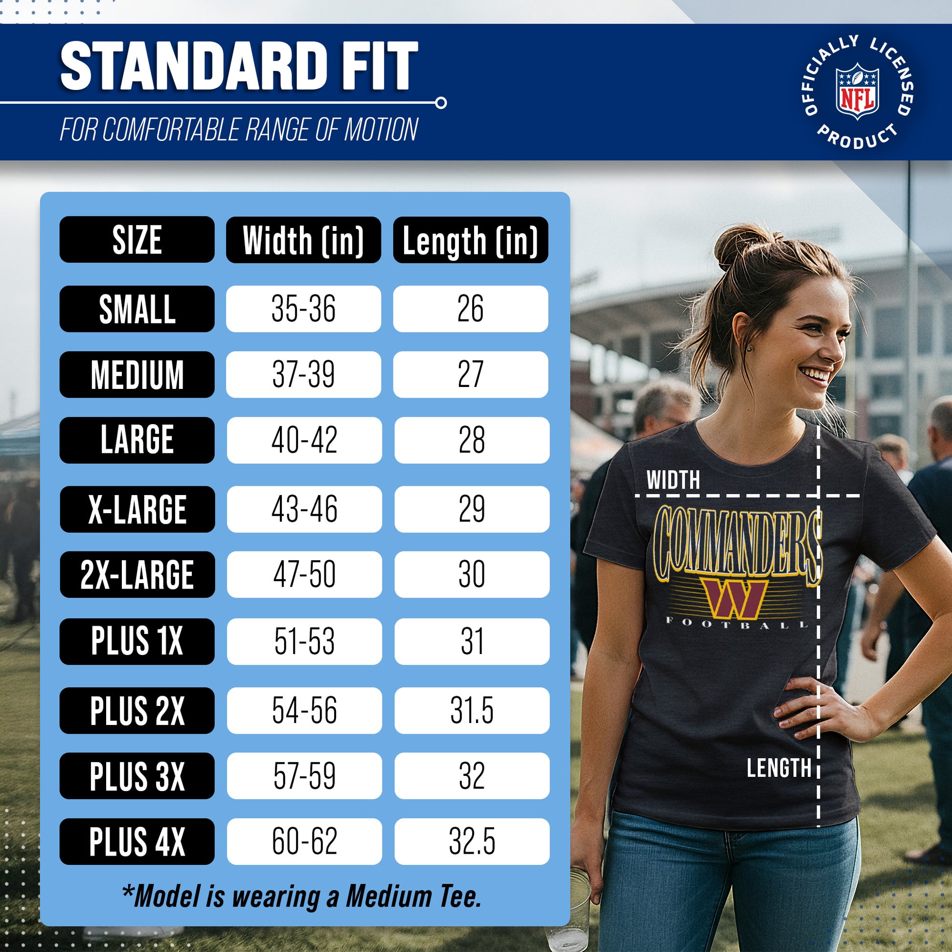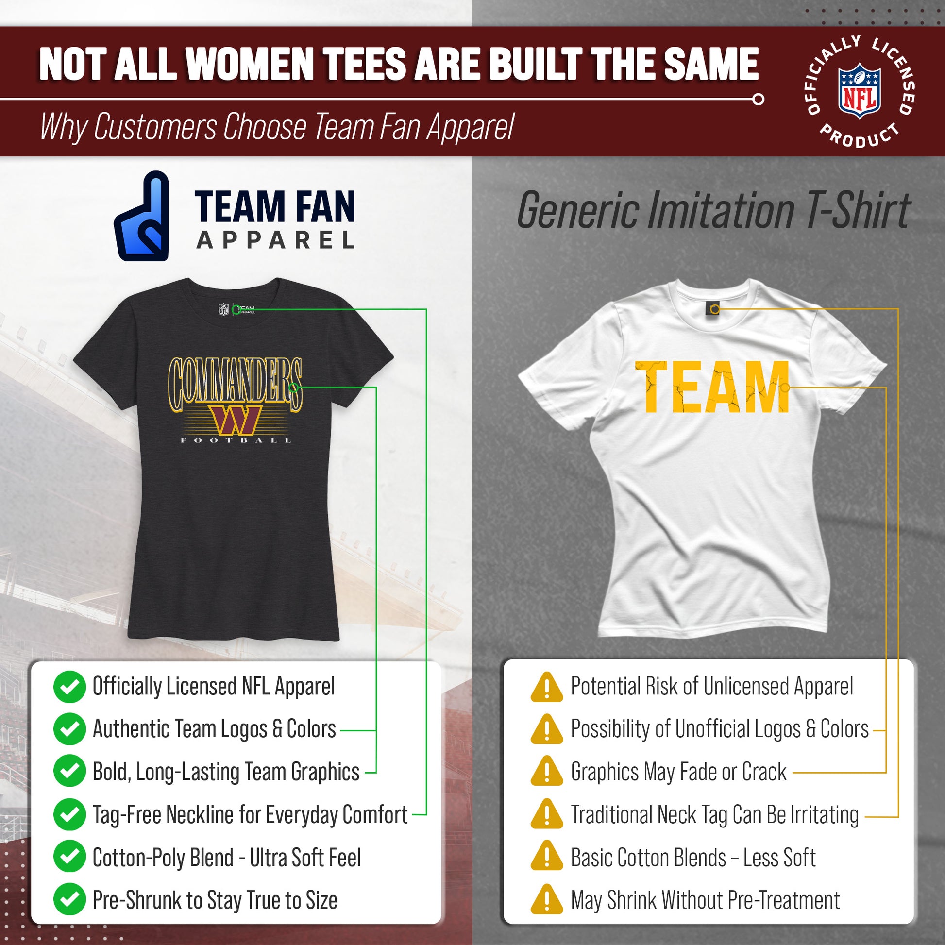 Calling all ladies! Get ready to rock game day with the Women's Team Fan Apparel Overtime Blueprint T-Shirt! This comfortable and stylish Washington Commanders womens tee is perfect for any female football fan, whether you're cheering on your favorite team at the stadium or watching from home. Made from a super soft cotton fabric , this shirt will keep you cool and comfortable all game long. The text, logo and official team color adds a touch of retro flair, while the tag-less design ensures itch-free wear. Whether you're a die-hard fan or just love a good classic look, this shirt is perfect for showing off your team spirit. Available in a wide range of women's sizes, it's suitable for all shapes and sizes! So grab your girlfriends and get ready to cheer on your team in style with the Women's Team Fan Apparel Overtime Blueprint T-Shirt!