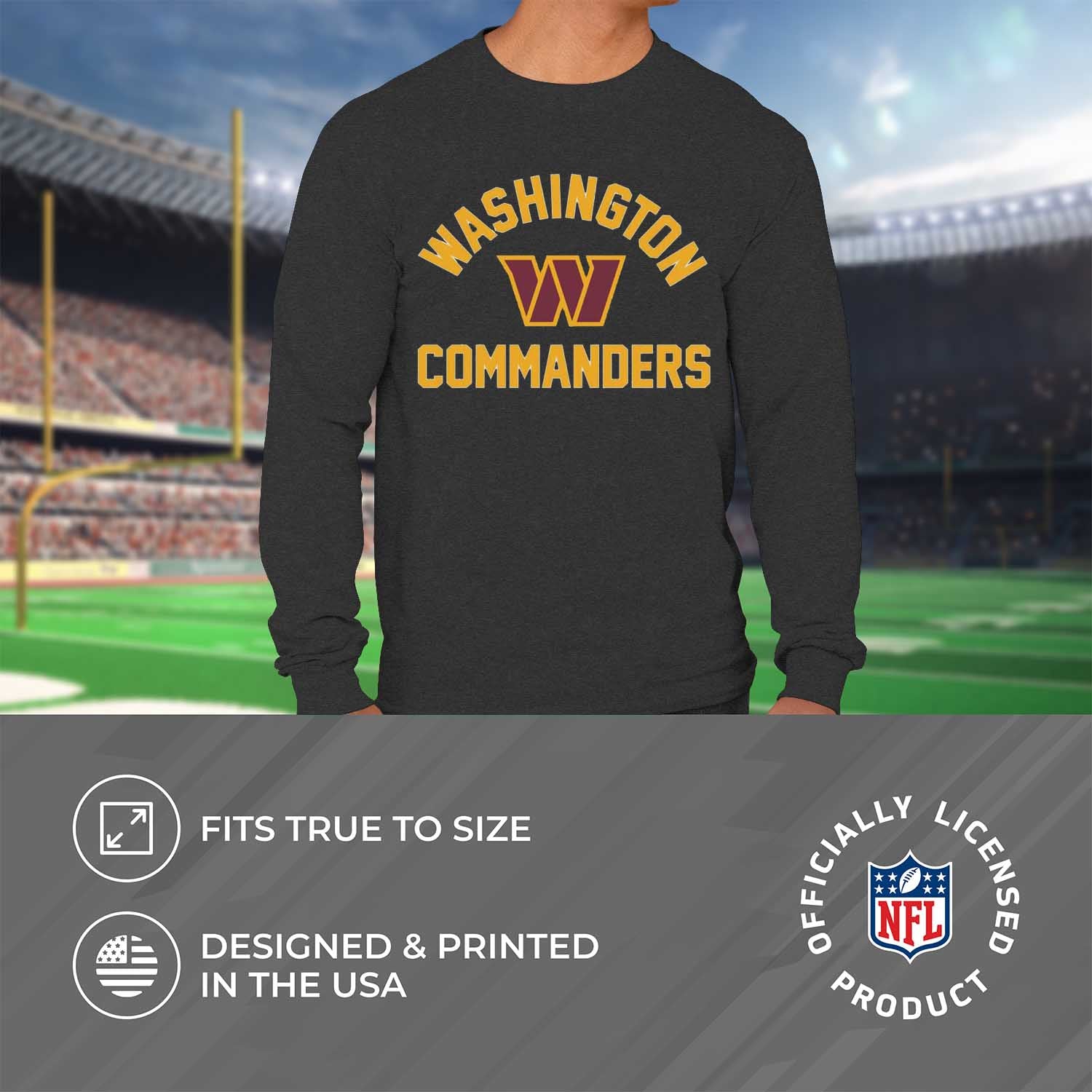 There's nothing more exciting than a much-anticipated gameday, and our Adult Gameday Washington Commanders long sleeve football tshirt is the ideal shirt to wear on gameday whether you're tailgating, at the game, at the bar, or watching from the comfort of your own home. This Washington long sleeve tshirt is super comfortable, runs true to size, and is great for showing team pride all year long! The tagless long sleeve shirt ensures the most comfortable fit all day long. This Washington long sleeve tshirt is made from a cotton poly blend. Our pro football long sleeve shirt features double-needle sleeve, bottom hems, and side seams for the best fitting long sleeve tee. This high quality Washington Commanders women and men apparel will make your game day comfortable and more enjoyable. Our Washington Commanders shirts really are the perfect fan apparel for tailgates and sports games. The lightweight long sleeve droptail shirt has side vent construction, making it ideal for warmer weather or as an extra layer during colder months. Our Washington shirts for men and women are essential Washington apparel for football fans. These are high quality Washington graphic shirts for men and women. The graphics will stay crisp wear after wear, and year after year. The thermal printed graphics are high definition, official true team colors, and also resist fading. This Washington Commanders long sleeve tshirt is made with high stitch density for smoother printing surface. Our pro Washington Commanders long sleeves for men and women make the best Washington gift. This piece of Washington Commanders apparel is the perfect birthday or Christmas gift for any professional sports fan. This long sleeve tee is absolutely perfect for tailgating, stadium fun, or watching the Washington Commanders game at home.