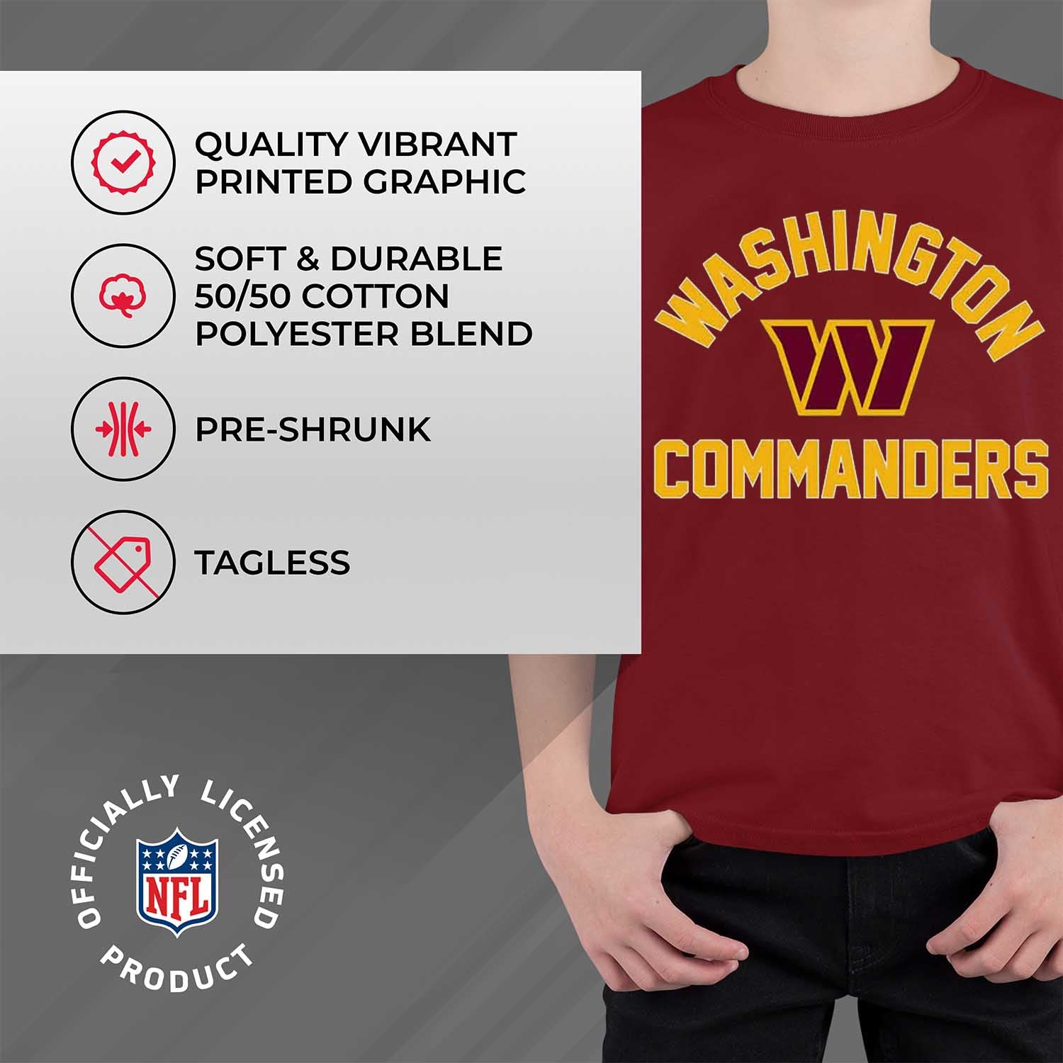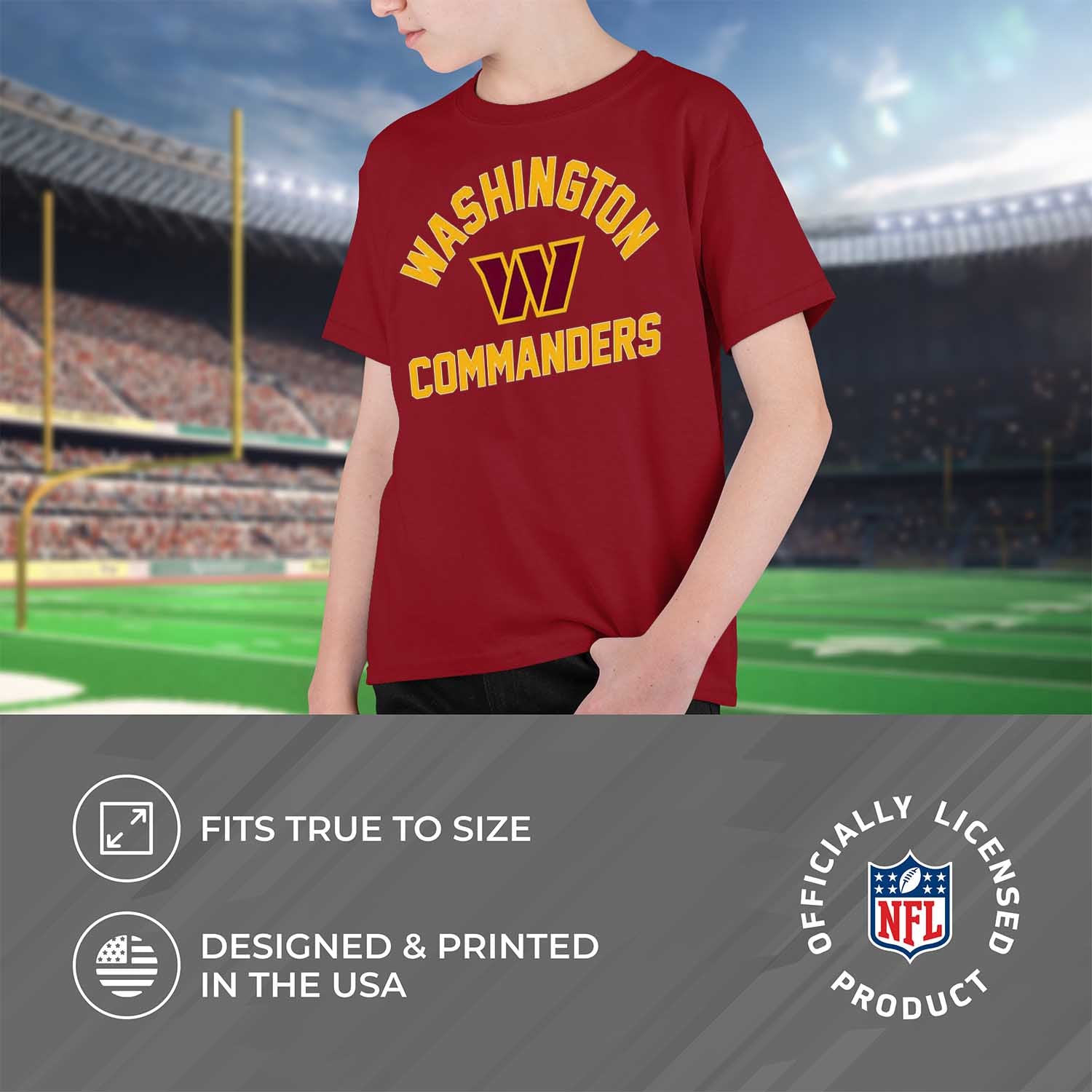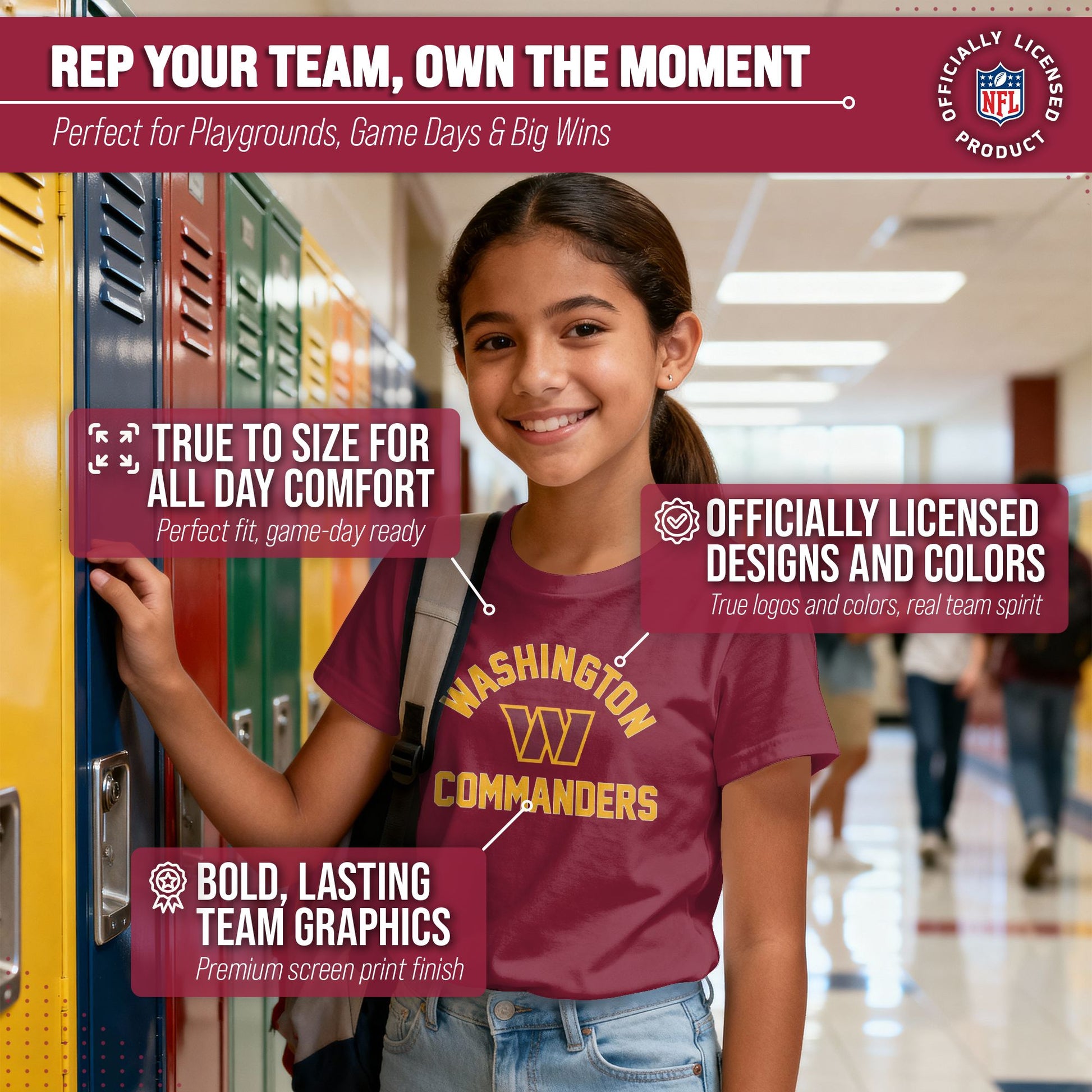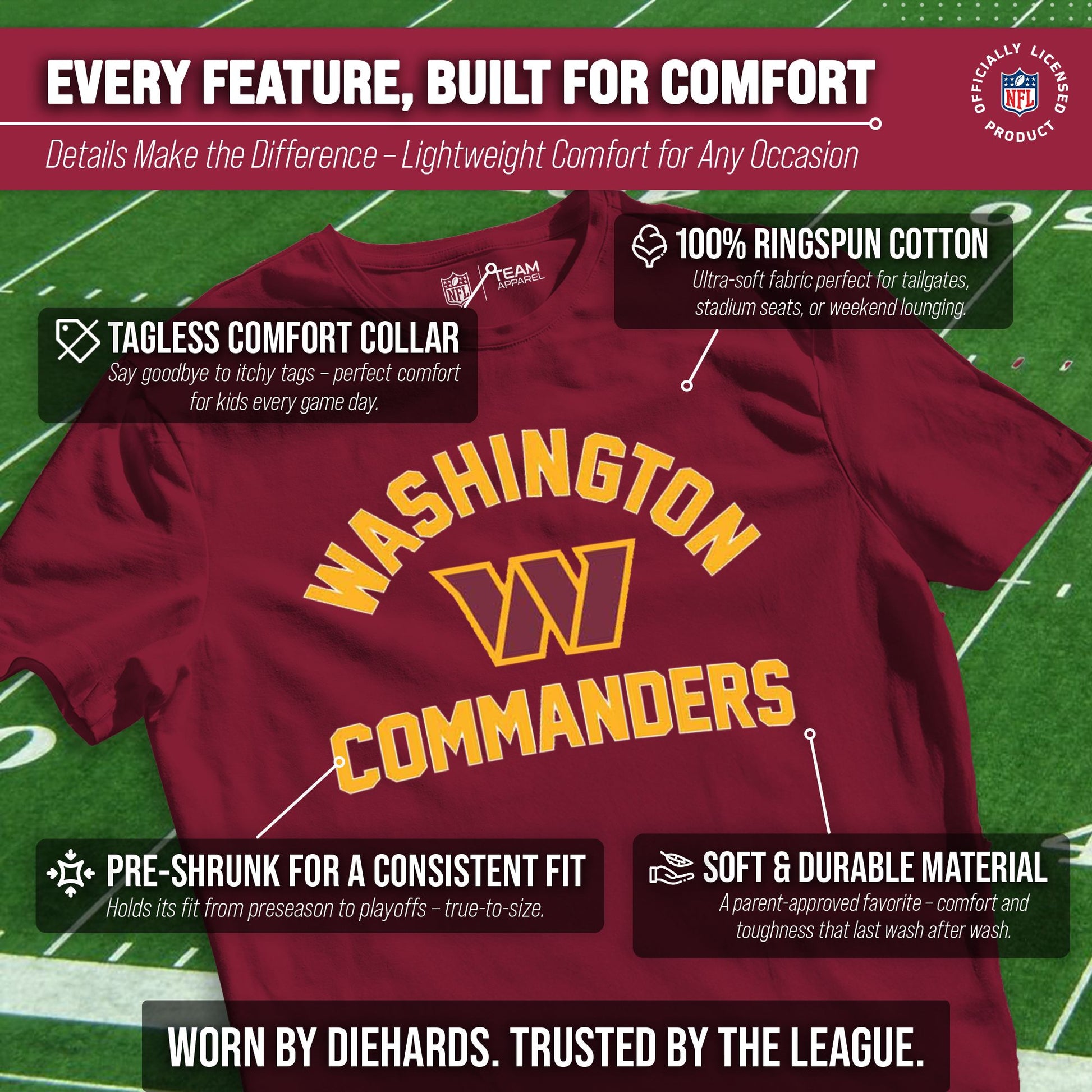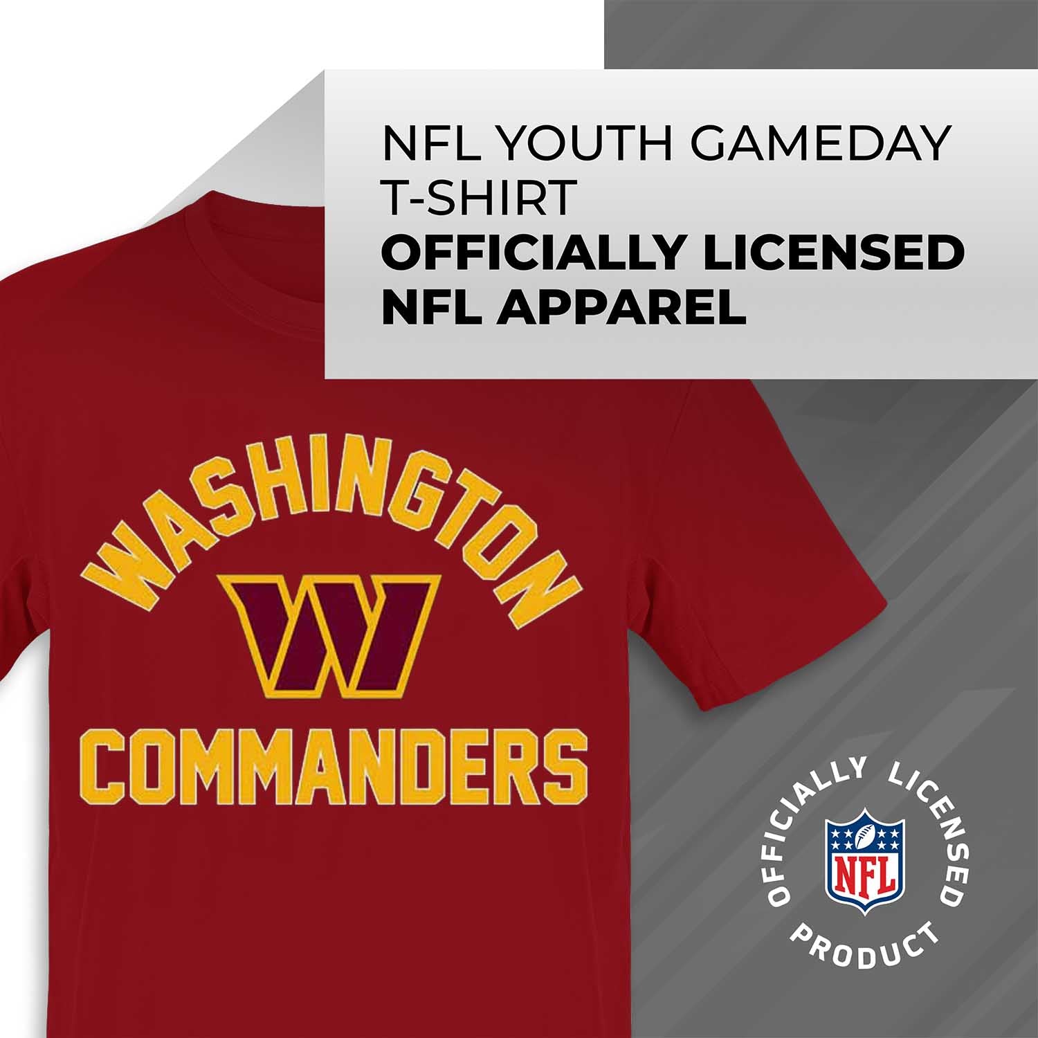 There's nothing more exciting than a much-anticipated gameday. Our Youth Gameday Washington Commanders football tshirt is the ideal shirt to wear on gameday whether you're at the game, or watching from the comfort of your own home. This Washington tshirt is super comfortable, runs true to size, and is great for showing team pride all year long! The semi-fitted style makes this the perfect Commanders youth shirt for both boys and girls. Our shirts really are the perfect fan apparel for school and sports games. The youth gameday shirt is lightweight and ideal for warmer weather or as an extra layer during colder months. Our Commanders shirts for boys and girls are essential apparel for young football fans. Our tagless Washington Commanders youth shirt ensures the most comfortable fit. This semi-fitted tshirt is made from a 50/50 cotton/polyester blend; contrast shoulder to shoulder neck tape and 1x1 rib knit neck makes for comfortable fit around the neck and shoulders. This high quality shirt for kids features a double-needle sleeve and bottom hems. These are high quality Commanders graphic shirts for girls and boys. The vivid graphics will stay crisp wear after wear, and year after year. The thermal printed graphics are high definition, official true team colors, and also resist fading. This Washington tshirt is made with high stitch density for smoother printing surface. Our official shirts for boys and girls make the best gifts. This piece of Washington Commanders apparel is the perfect birthday or Christmas gift for any young football fan. This tee is absolutely perfect for school, stadium fun, or watching the game at home.