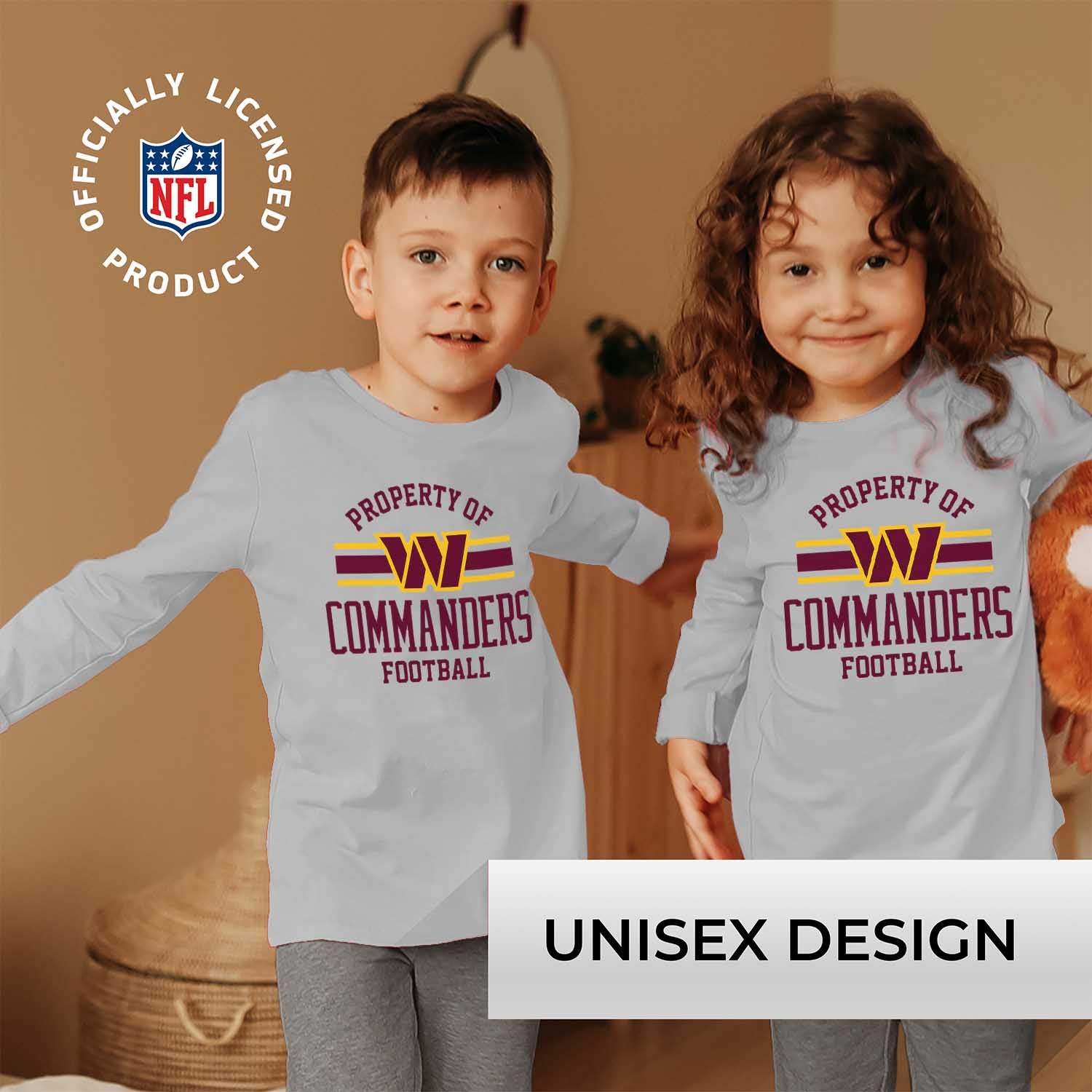 Our Property of Washington Commanders youth crew sweatshirt is a pro football crew with 52% cotton and 48% polyester blended lining that features official Property of graphics. Our crews for boys and girls are super comfortable, run true to size, and are great for showing your Washington pride all year long. The tagless Commanders crew sweatshirt is perfect for school, gamedays, and showing off your team spirit. Our pullover crews are ideal Washington gifts for boys and girls football fans and the unisex fit makes them ideal for both boys and girls. The Washington crew is essential kids apparel for protecting yourself from the elements. The blended material, ribbed cuffs, and waistband keep all the warmth in, so there's no need for a jacket in the fall months, our crew sweatshirts have you covered. These comfortable crews feature the official Washington Commanders colors and graphics. The graphics will stay crisp and wear after wear and year after year. This youth pro football sweatshirt is designed for comfort and features ribbed cuffs and waistband, and a spacious front pouch pocket. Show your team pride with this Property of Commanders youth sweatshirt! This crew is made from a dual blend of cotton poly blend that is ideal for that tailgate or gameday when the temperature drops. The football sweatshirts for girls and boys help you gear up and get ready to cheer the Washington Commanders to victory.