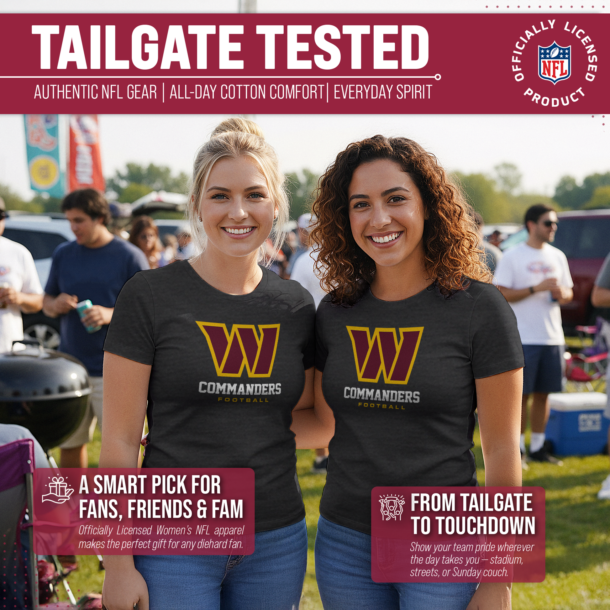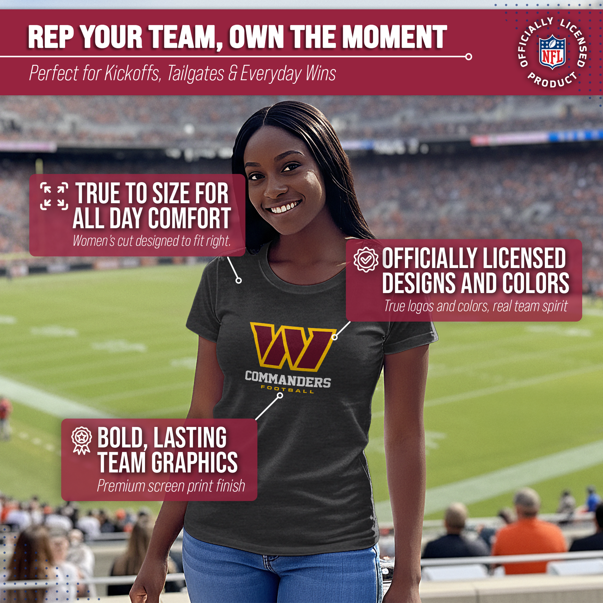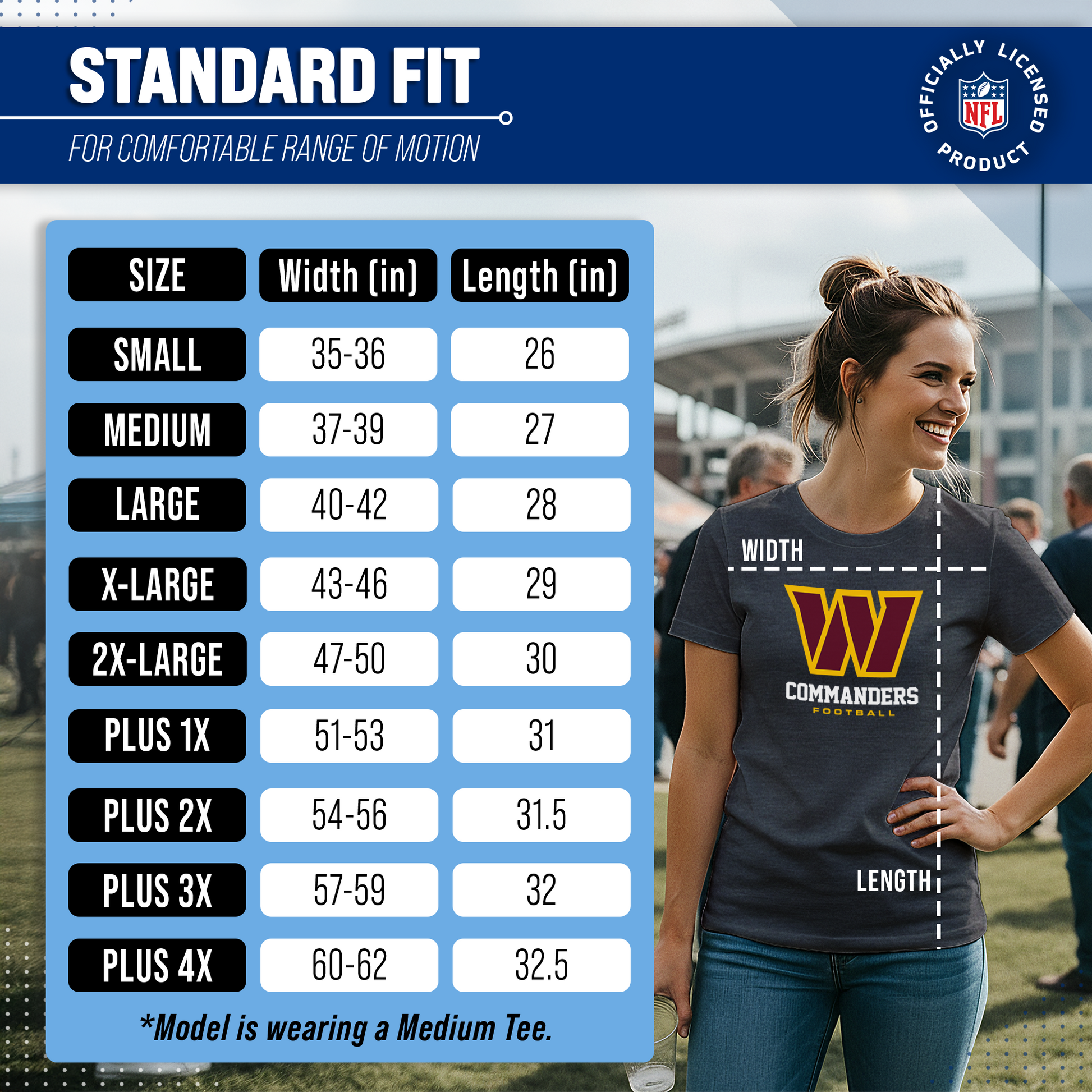 Score with Team Fan Apparel, the ultimate destination for officially licensed NFL apparel for men and women. We use only the highest-quality screen printing techniques to bring you the most comfortable, durable, and stylish clothing possible. Go ahead and show your team pride at the big game or any time! This premium womens t-shirt comes in small, medium, large, XL, and XXL. So needless to say, it fits Washington Commanders fans of all types! Maybe you aren't a Commanders fan but you know someone who is? Don't worry! This high-quality t-shirt is soft, lightweight, breathable, and a GREAT gift for any birthday, anniversary, Mother's day, Valentine's day, or Christmas gift! So, if you want to stand out as the #1 female fan at the next big game or watch party, you're going to want to be wearing one of these Washington Commanders Women's Big Logo t-shirts.