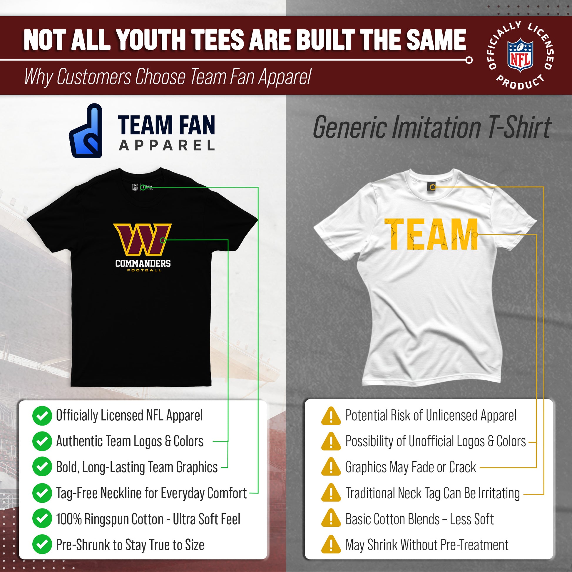 Score with Team Fan Apparel, the ultimate destination for officially licensed NFL apparel for all whether with youth or adult we got you covered . We use only the highest-quality screen printing techniques to bring you the most comfortable, durable, and stylish clothing possible. Go ahead and show your team pride at the big game or any time! This premium youth t-shirt comes in small, medium, large, XL. So needless to say, it fits young [team_long] fans of all types! Maybe you aren't a [team_nickname] fan but you know someone who is? Don't worry! This high-quality t-shirt is soft, lightweight, breathable, and a GREAT gift for any birthday or Christmas gift! So, if you want your young fan to feel bold and proud at the next big game or tailgate, you're going to want to be getting your hands on our [team_long] Youth Big Logo t-shirt today!