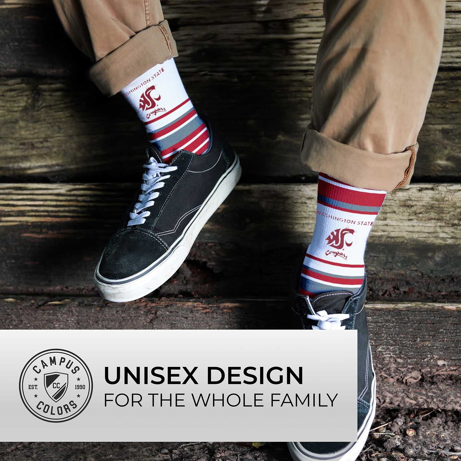 These Washington State Cougars socks for men and women are great for showing off your Washington State pride from head to toe. The unisex socks are comfortable enough to wear to the gym, the game, the tailgate, or nowhere at all. The crew length and poly-spandex blend featuring a supportive formed heel make them a comfortable choice for showcasing your love for your team all year long. Cougars socks pair well with Washington State shoes and are great additions to any collection of Washington State Cougars stuff. Wear them with shorts, your favorite jersey, and Washington State shoes for a super fan look, or rock them in the office for an alternative on casual Friday. On a lazy day, wear them with your Washington State underwear or pajamas while you put your feet up and enjoy a game on your tv at home. These Washington State crew socks make great gifts for all ages, perfect father's day gift, birthday gift, or holiday stocking stuffers. The officially-licensed team logo, colors, and graphics make these Washington State Cougars socks the socks women and men will love forever. Fabric content is 95% polyester, 2% nylon, 2% rubber, and 1% spandex. Machine washable, tumble dry low.