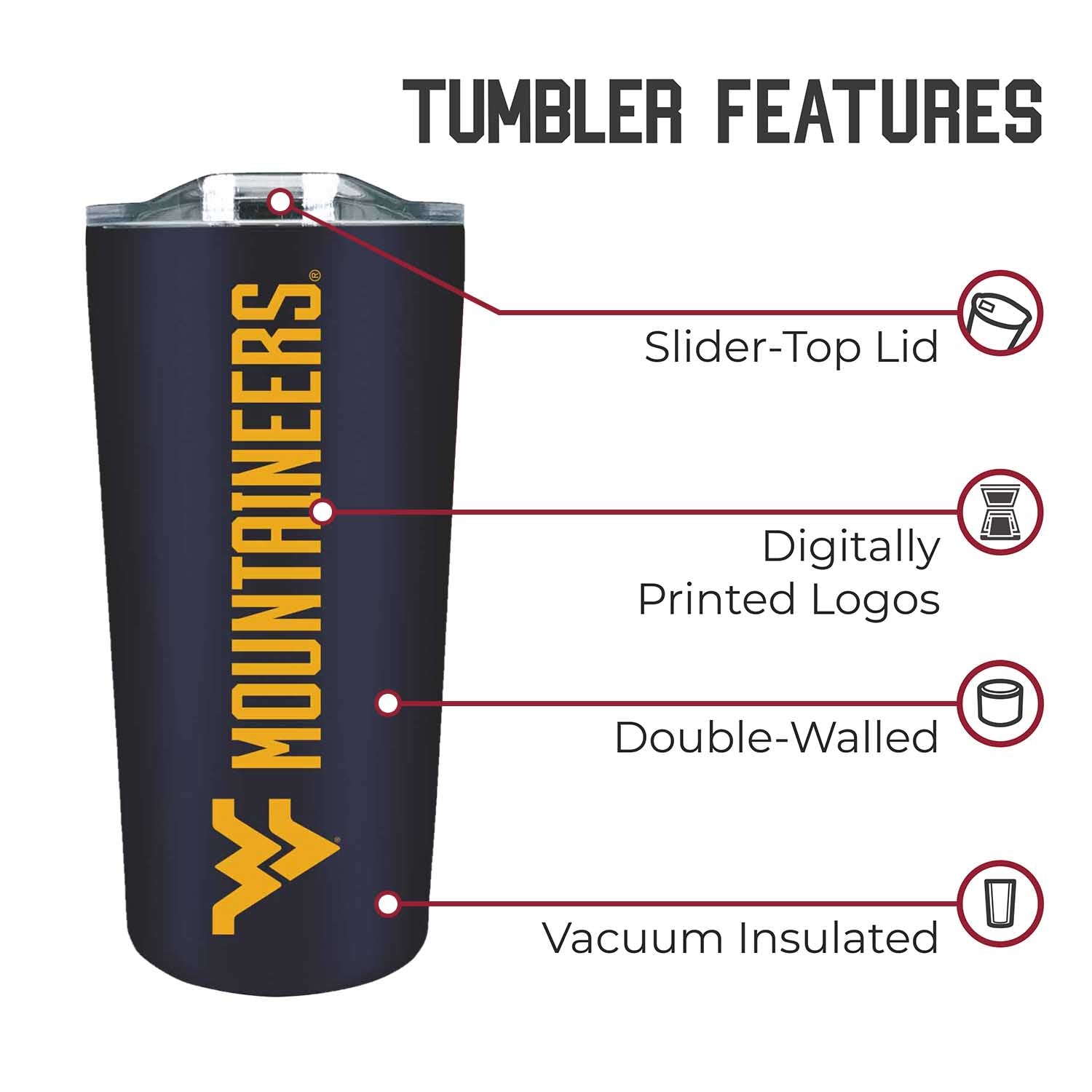 Our stainless steel tumbler mugs are designed for constant use in any type of setting! At a sports game? These insulated tumblers are compact and can fit in most cup holders. On the move? Our contoured spout makes it easy to sip on the go! Your tumbler is there to compliment your West Virginia sweatshirt when you need to stay warm and there when you're looking for an ice-cold refreshment. No matter the setting, show your school pride while properly and efficiently preserving the desired temperature of your beverage! This West Virginia Mountaineers travel mug also makes a great gift if you're looking to give someone a cool Mountaineers novelty, this West Virginia Mountaineers travel mug compliments any kind of Mountaineers apparel. Combine the West Virginia water bottle with a West Virginia pillow, a West Virginia face mask, and a West Virginia blanket and give a whole haul of Mountaineers gear to your favorite West Virginia Mountaineers alumni! All of our products feature the official team colors, logos and lettering. We don't skimp on quality in any way. The colors are always vibrant and the graphics are always accurate and brimming with team spirit.