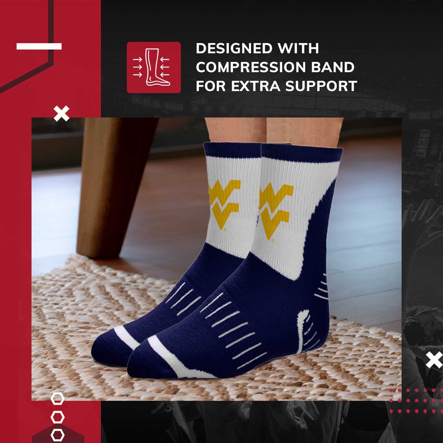 These Adult Surge Quarter Length Socks are the perfect way to show your team spirit on game day or any day. When you are rooting for West Virginia Mountaineers these socks are the perfect complement to any apparel for both mens and womens. As the must have West Virginia gifts, these West Virginia socks complement your Mountaineers clothing all year long and when watching college football West Virginia. Coordainates with West Virginia attire for men.
