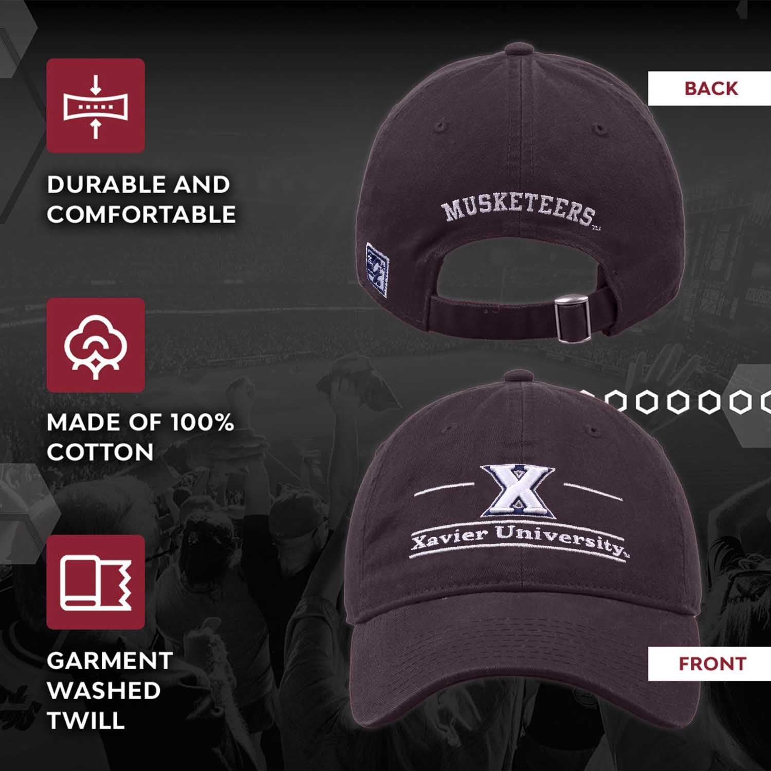 Looking for a way to support your team? Try this Xavier Musketeers game bar hat! These Xavier Musketeers caps are made from 100% garment-washed cotton twill. This Xavier hat also features a relaxed and unstructured design, making it a perfect Xavier Musketeers fitted Musketeers hat. It boldly displays the Xavier Musketeers embroidered logo so you can represent the Xavier. In addition, the Xavier Musketeers logo with the school wordmark is on the front of the hat in a bar design. The team wordmark is on the back of the Musketeers baseball cap. This gameday hat has a metal closure to ensure an adjustable size. Wear these caps for women and men along with your favorite Xavier clothes, clothing & apparel. These ball caps for men and women are the perfect Xavier Musketeers gifts for men. Buy one for yourself, your dad, or any fan. Whether tailgating at Xavier football games or cheering from home, show your team pride by wearing your Xavier gear with your Xavier cap.