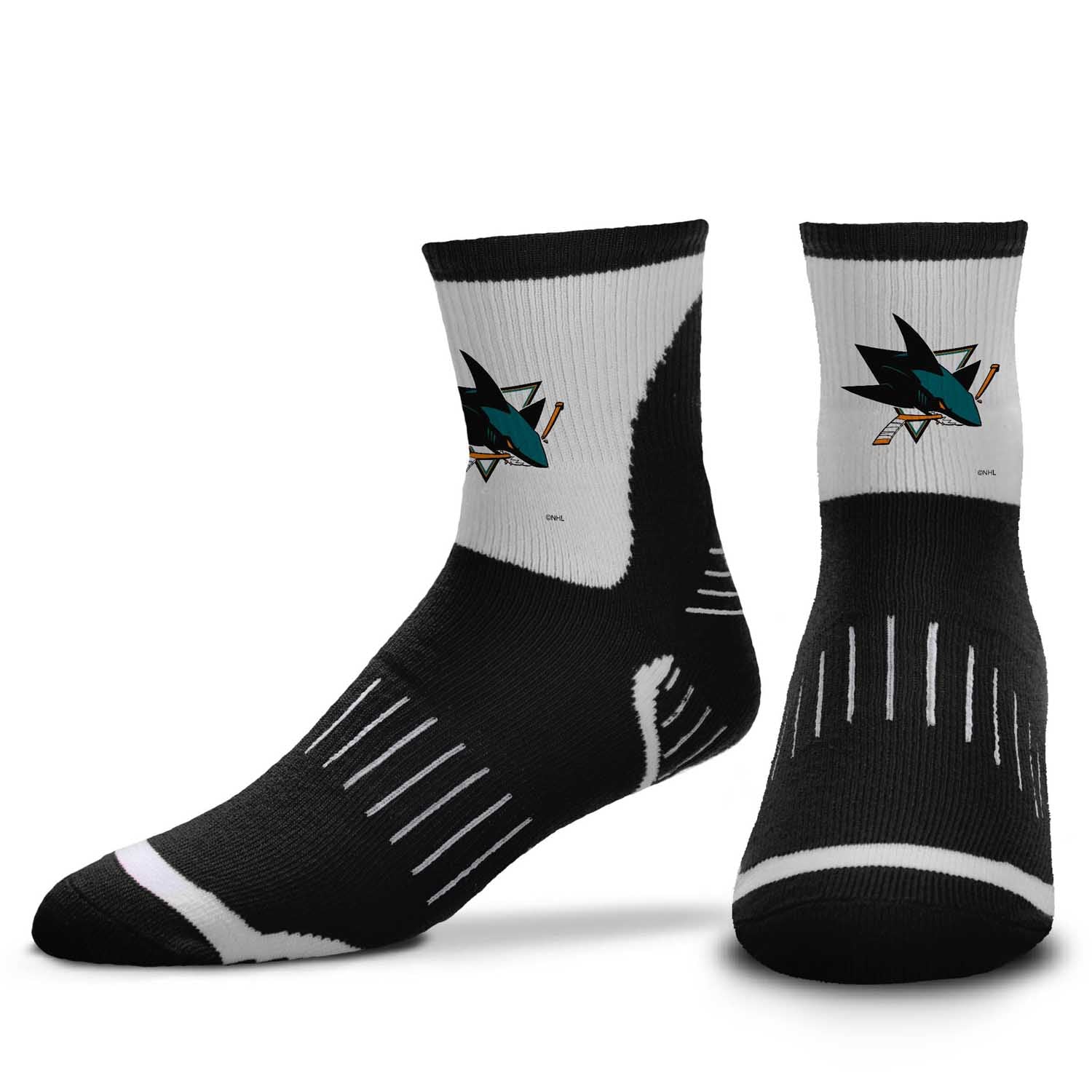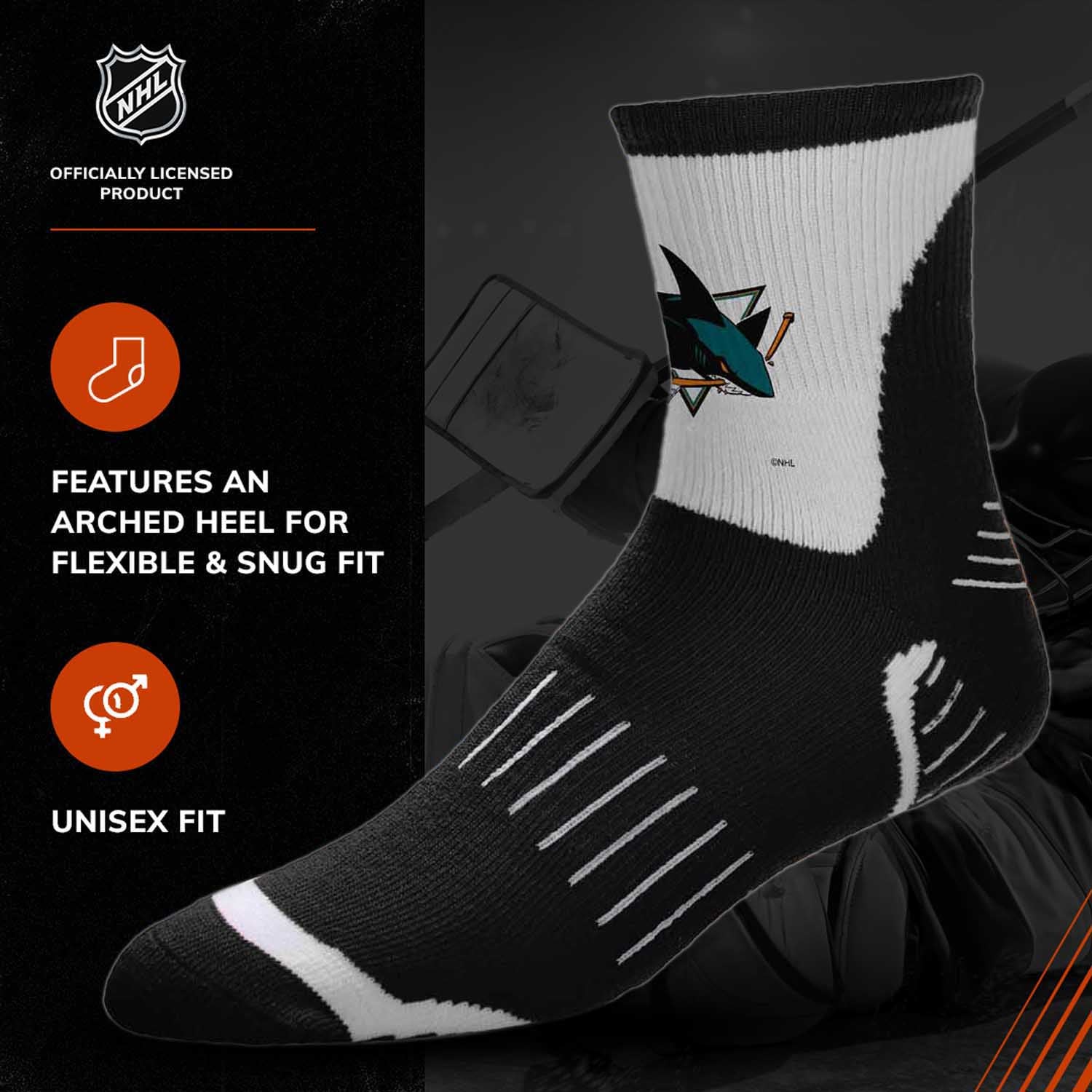 Looking your best while cheering on your favorite NHL team is easy with these officially licensed NHL youth crew socks! These San Jose Sharks kids hockey socks youth feature the authentic NHL team logo and colors and are made from a comfortable polyester blend fabric. They're the perfect addition to your game day outfit, especially when paired with a jacket, jersey, or any apparel of your choice. Wear them with your go-to sports shoes or gloves and your child is good to go! For a more complete look, add a t-shirt or hoodie. These youth hockey socks for boys and girls make great gifts for the ultimate fan in your life! Ideal for kid hockey fans, give as stocking stuffers for kids or birthday gifts for boys or girls. Wear over or under hockey skate socks or as San Jose Sharks dress socks making them the ideal hockey gifts kids.